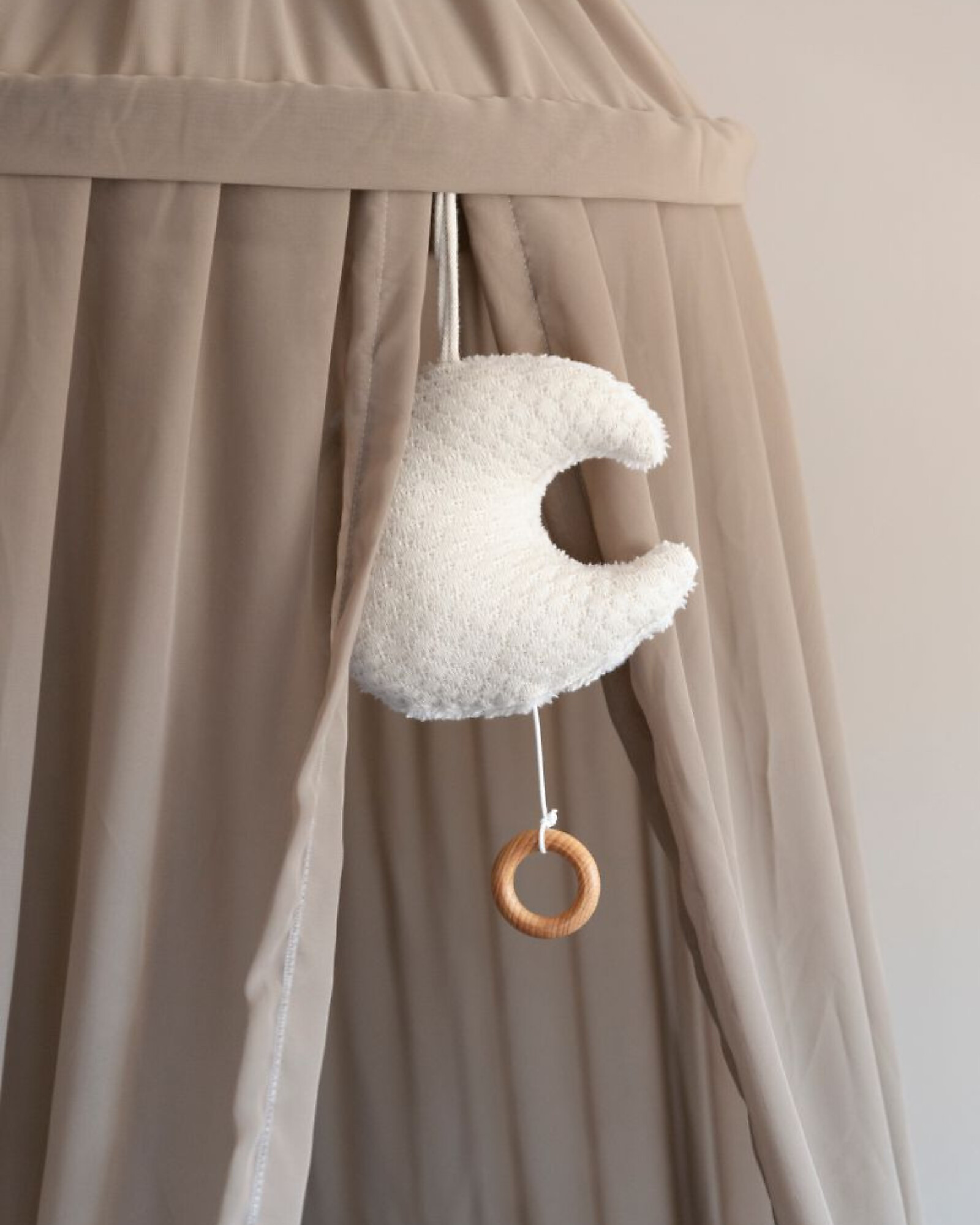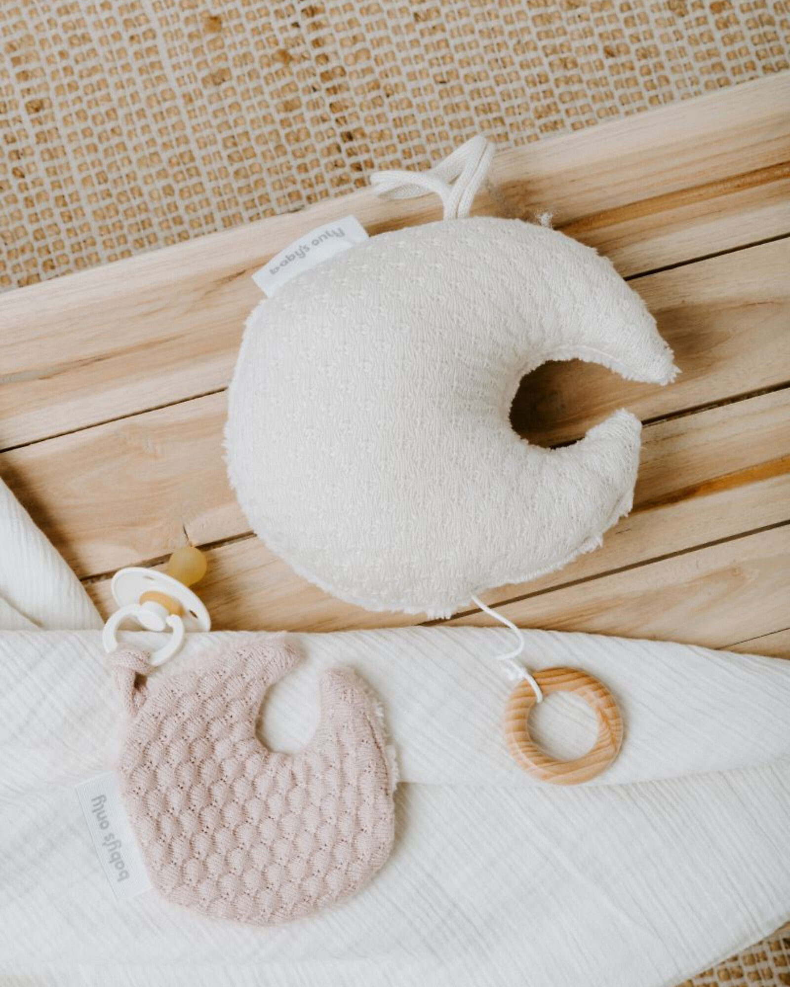 Trasforma la cameretta in uno spazio calmo e incantevole con il carillon a forma di luna della collezione Sky di Baby’s Only. Questo affascinante carillon, con il suo caratteristico motivo a maglia, è una gioia per gli occhi e crea un’atmosfera accogliente e avvolgente nella stanza del tuo piccolo. Il design morbido e giocoso della luna lo rende un vero e proprio oggetto imperdibile per ogni cameretta.