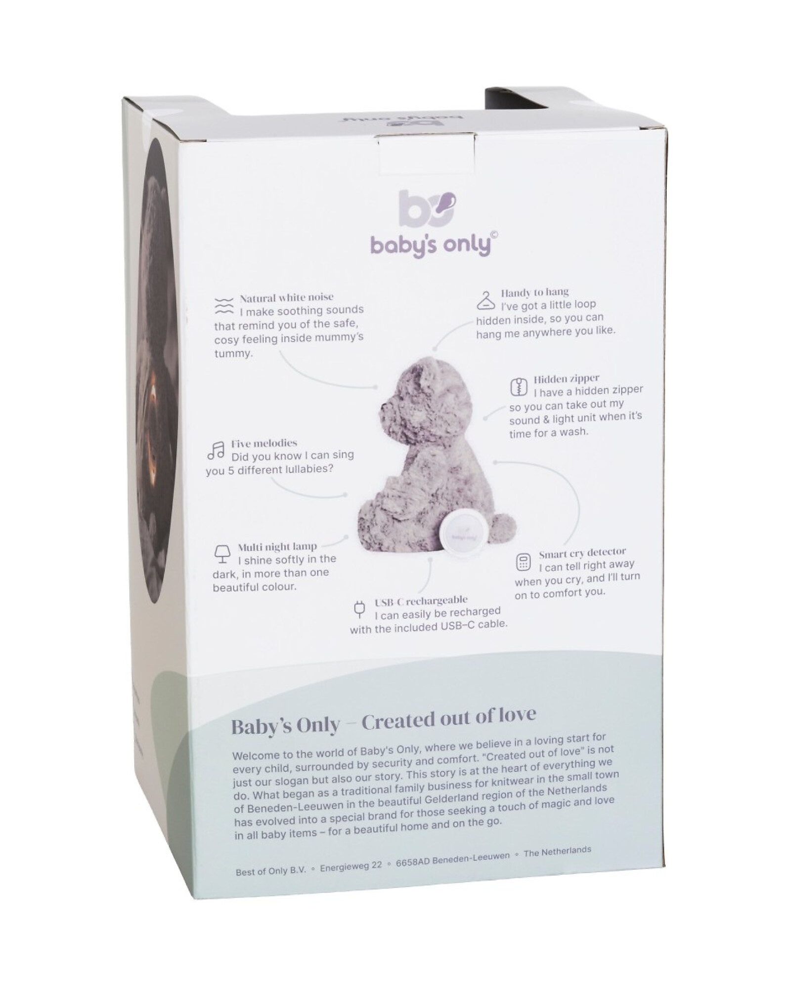 Un amico che accompagna i piccoli in ogni momento, rassicurandoli con il suono bianco che ricorda il calore e la protezione del ventre materno. Con la sua melodia dolce e i suoni naturali, aiuta a cullare il bambino verso un sonno tranquillo.