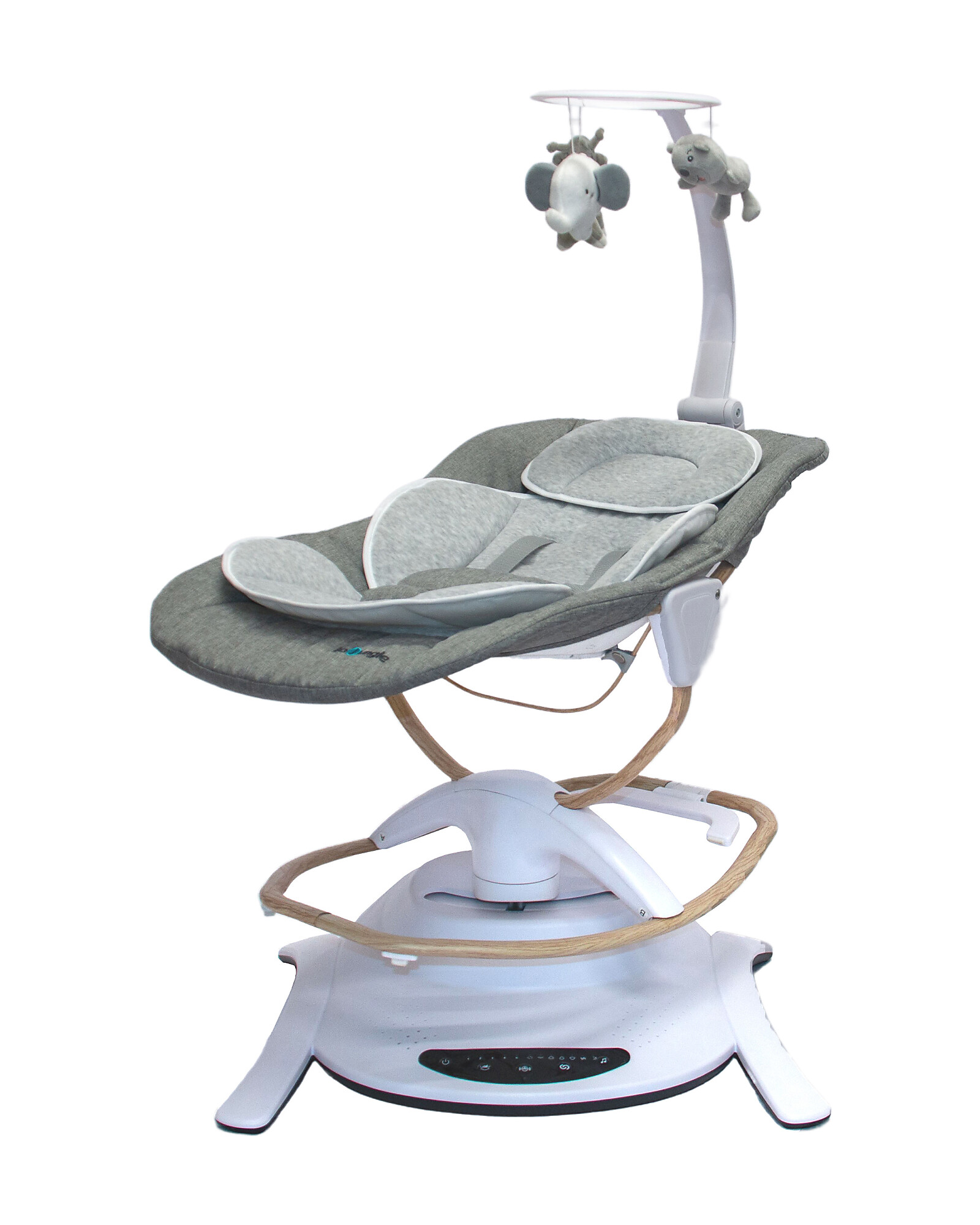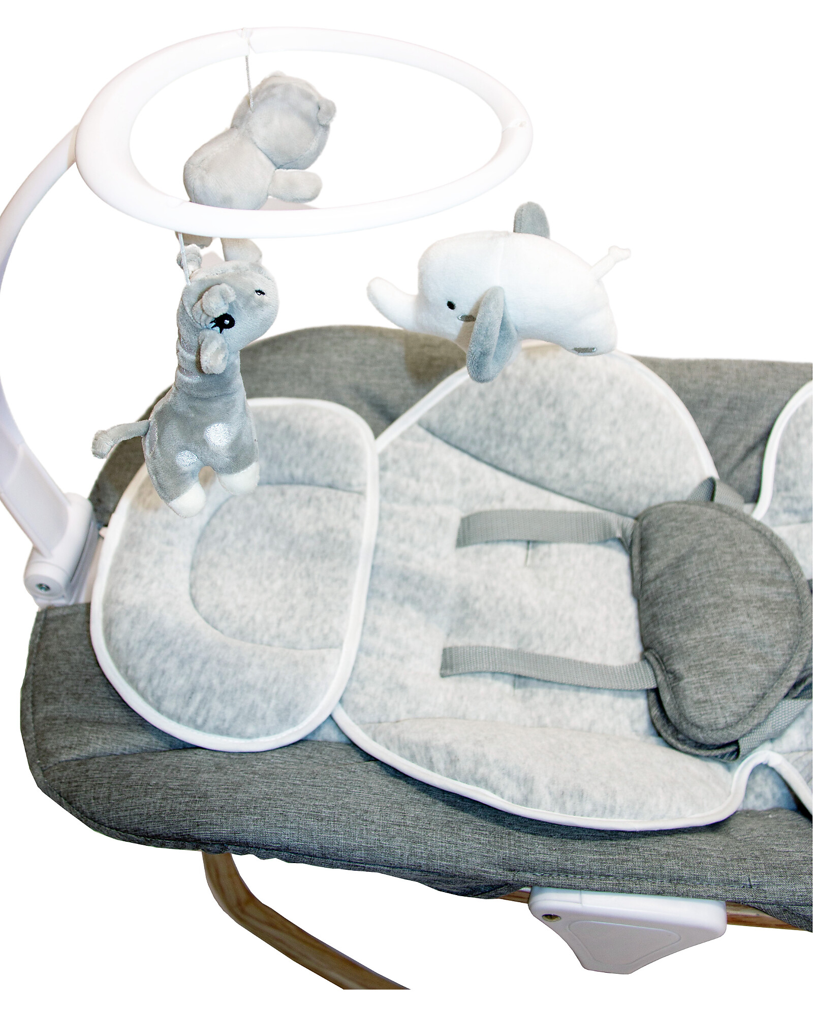 Dotata di cintura di sicurezza a 5 punti, assicura protezione durante l’uso. L’arco giochi con peluche stimola i sensi del bambino, mentre le melodie incorporate favoriscono il rilassamento. Funziona sia con cavo di alimentazione che a batterie, ed è facile da montare e pulire.