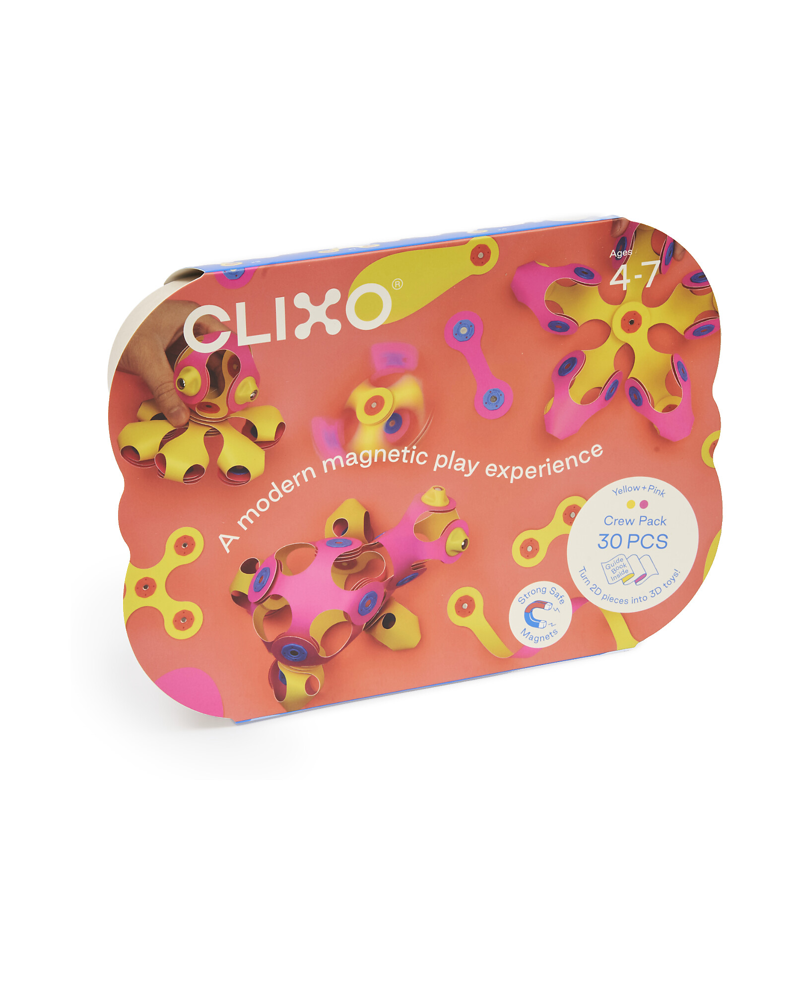 Infinite possibilità di rendere reale la tua immaginazione, con Clixo! Il set Crew pack è costituito da 28 pezzi di varie forme, dalle quali potrai creare innumerevoli disegni in 3D coloratissimi, basterà un semplice click e i potenti magneti faranno il resto. Realizzato in carta sintetica riciclabile, ha ai suoi estremi dei magneti che ti permetteranno di realizzare forme su forme! Con i 2 spinner inclusi aggiungerai un tocco divertente al gioco, aumentando le possibilità creative! E’inoltre lavabile in lavastoviglie! Un giocattolo versatile e coloratissimo che incoraggia l’apprendimento STEAM, l’avvicinarsi alle discipline scientifiche, artistiche e matematiche attraverso il gioco. Lo potrai portare sempre con te, perché Clixo è un giocattolo compatto, leggero che si adatta alla tua mano!