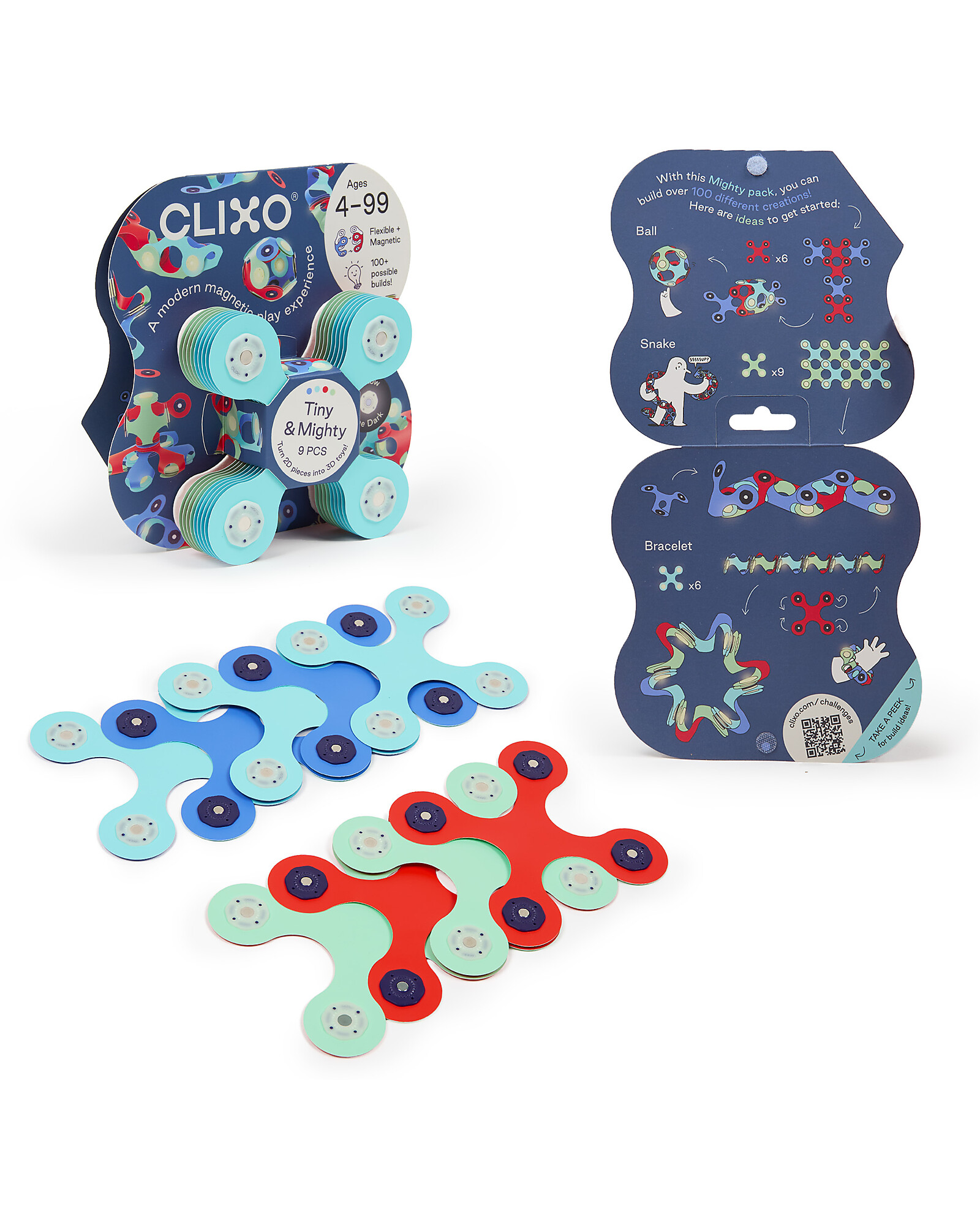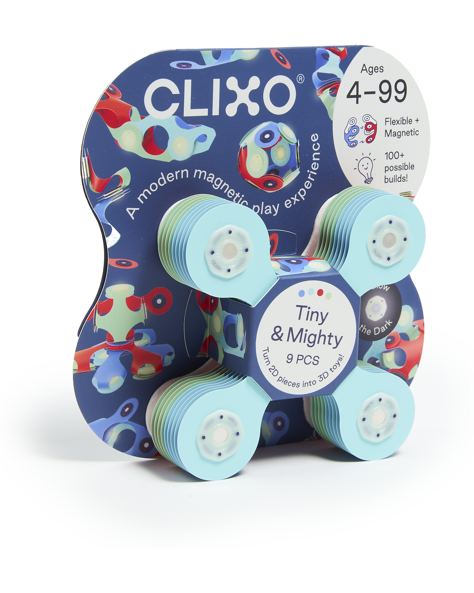 Infinite possibilità di rendere reale la tua immaginazione, con Clixo! Il set Tiny&Mighty è costituito da nove pezzi nella caratteristica forma Quad, dalle quali potrai creare innumerevoli forme 3D coloratissime, basterà un semplice click e i potenti magneti faranno il resto. Realizzato in carta sintetica riciclabile, ha infatti ai suoi estremi dei magneti che ti permetteranno di realizzare forme su forme! E’inoltre lavabile in lavastoviglie! Un giocattolo versatile e coloratissimo che incoraggia l’apprendimento STEAM, l’avvicinarsi alle discipline scientifiche, artistiche e matematiche attraverso il gioco. Lo potrai portare sempre con te, perché Clixo è un giocattolo compatto, leggero che si adatta alla tua mano!