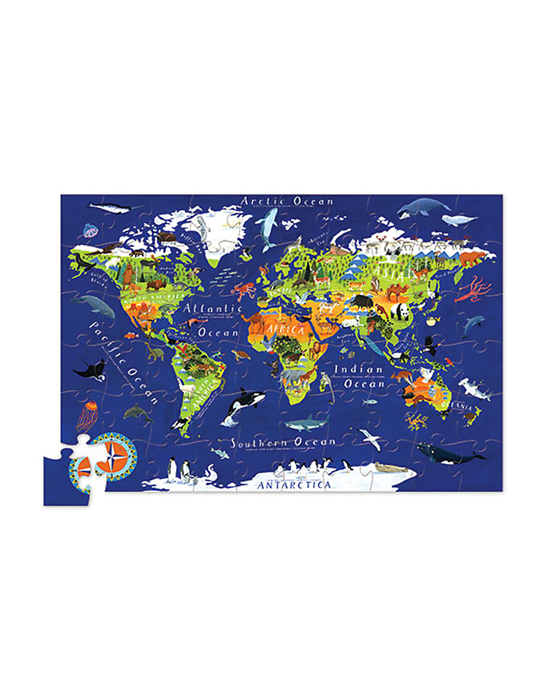 Un puzzle di 60 pezzi racchiusi in una bellissima scatola dalla forma insolita. Piacerà ancor prima di essere aperto questo Puzzle in Scatola Tonda di Crocodile Creek. Questo puzzle ha tanti pezzi ed è adatto a bambini dai 5 anni in su. La scatola, così come il disegno del puzzle stesso, raffigura la mappa del mondo e i suoi animali in una bellissima illustrazione dai colori sgargianti. Dove si trovano i leoni? E le orche? Un gioco favoloso e utile per iniziare a conoscere il mondo e le sue creature! Divertente come un puzzle, educativo come una lezione di geografia!