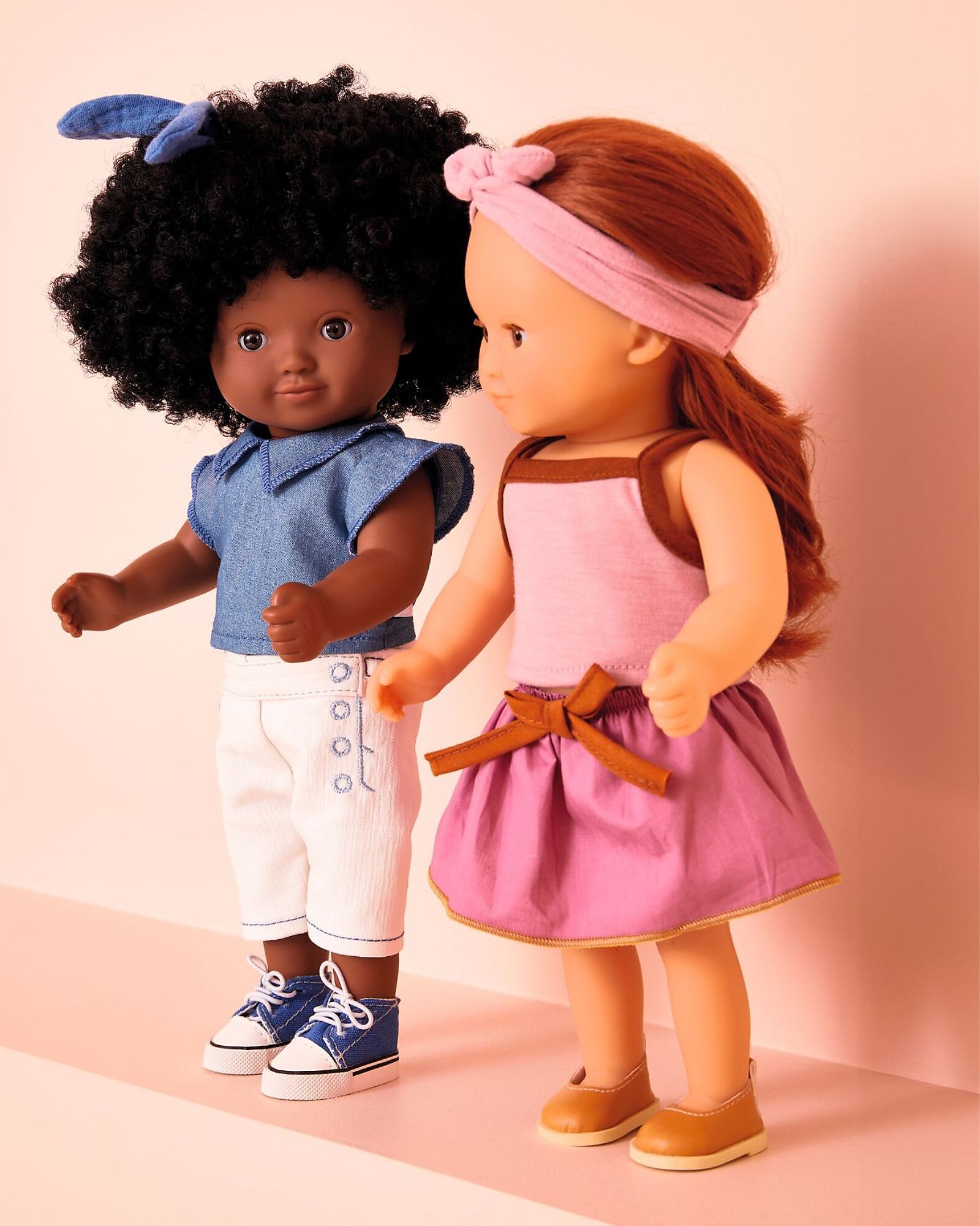 - Include: 1 bambola femminile in vinile (32 cm) con capelli lunghi e ondulati, 1 maglietta bicolore senza maniche, 1 gonna, 1 paio di pantaloni, 1 fascia per capelli e 1 paio di scarpe ballerine