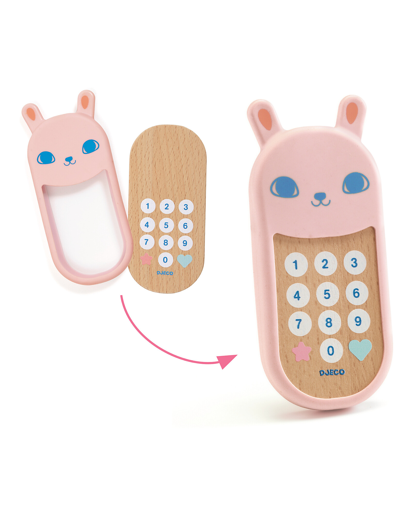 - Include: 1 borsetta in tessuto ricamato con accessori,1 telefono con la sua cover a coniglietto, 1 mazzo di 3 chiavi, 1 orologio in legno.