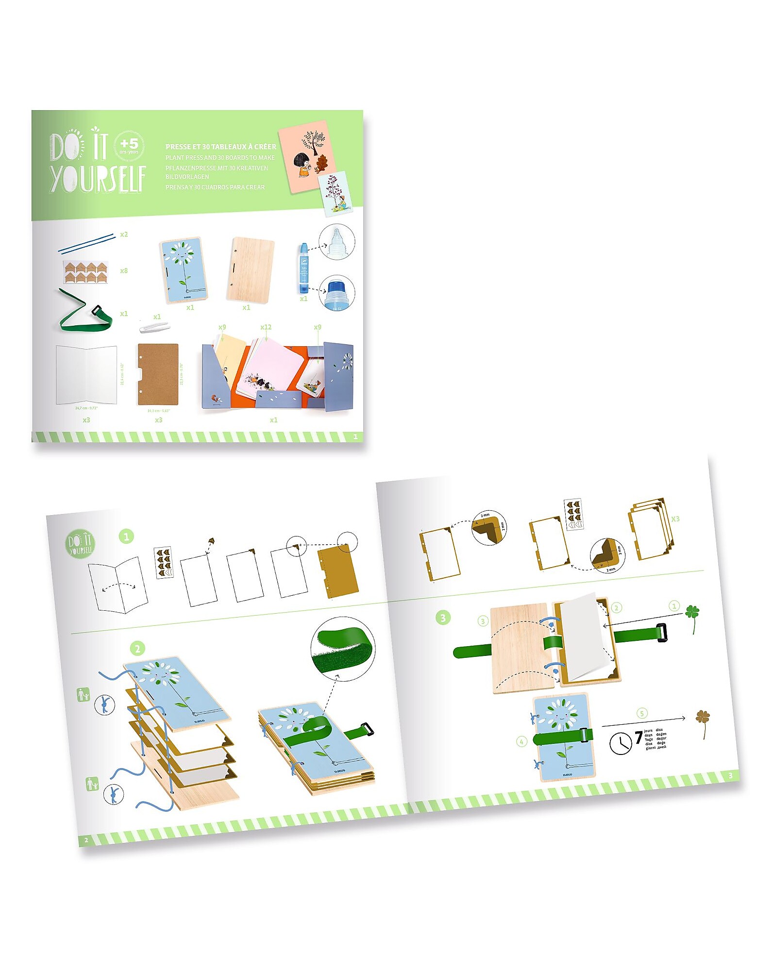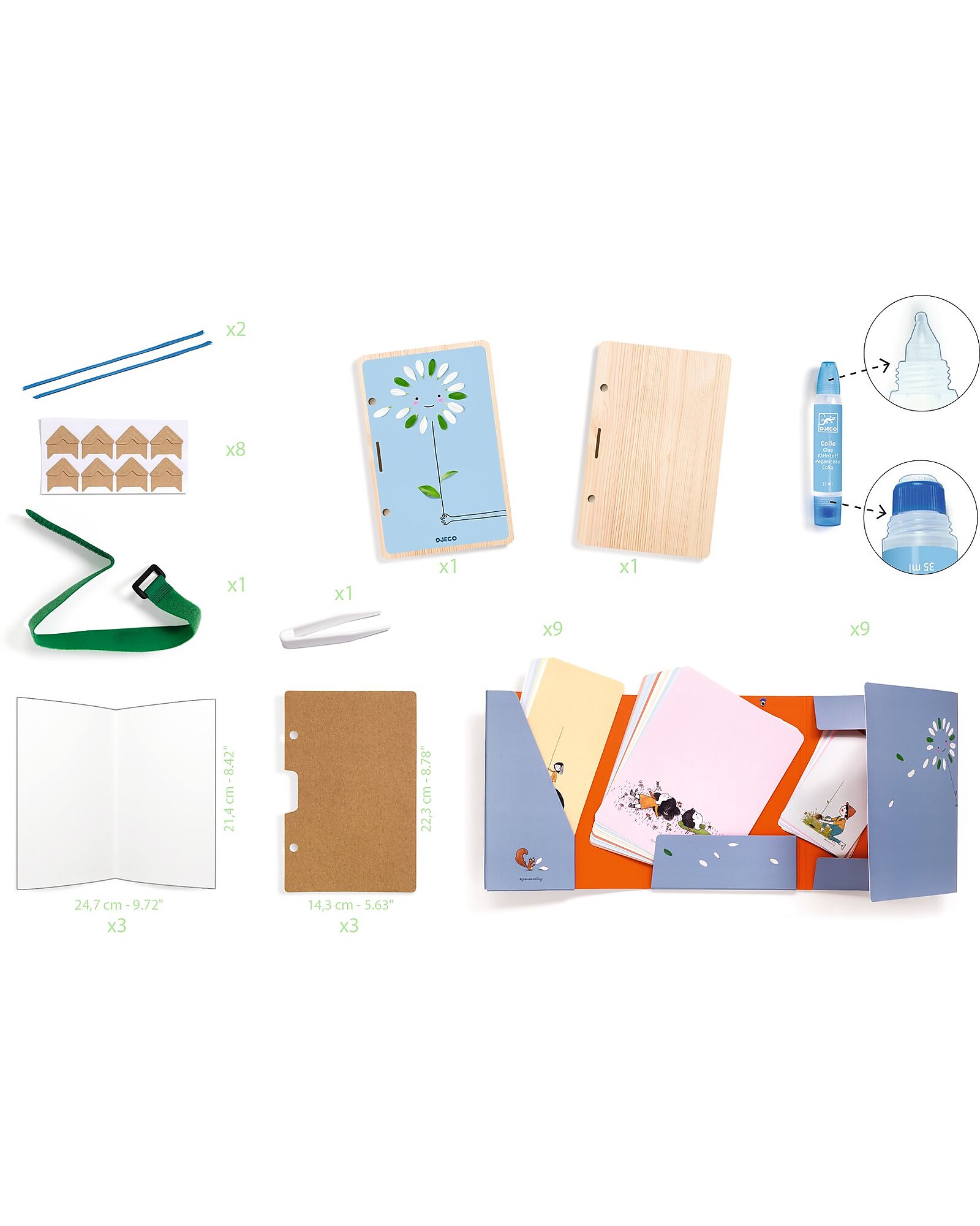 - La confezione include: 1 pressa in legno da assemblare (2 assi di legno illustrate e perforate, 1 cinturino in velcro, 3 pannelli di cartone, 8 adesivi angolari, 3 fogli di carta, 2 elastici), 1 custodia illustrata, 12 tavole illustrate ( 18,5 x 23,5 cm), 9 cartoncini grandi (10,5 x 25 cm), 9 cartoncini piccoli (10 x 15 cm), 1 tubetto di colla liquida a doppia estremità (un'estremità larga e una di precisione per facilitare l'attività di collage) e un avviso che guida il bambino passo dopo passo in tutte le fasi della sua creazione.