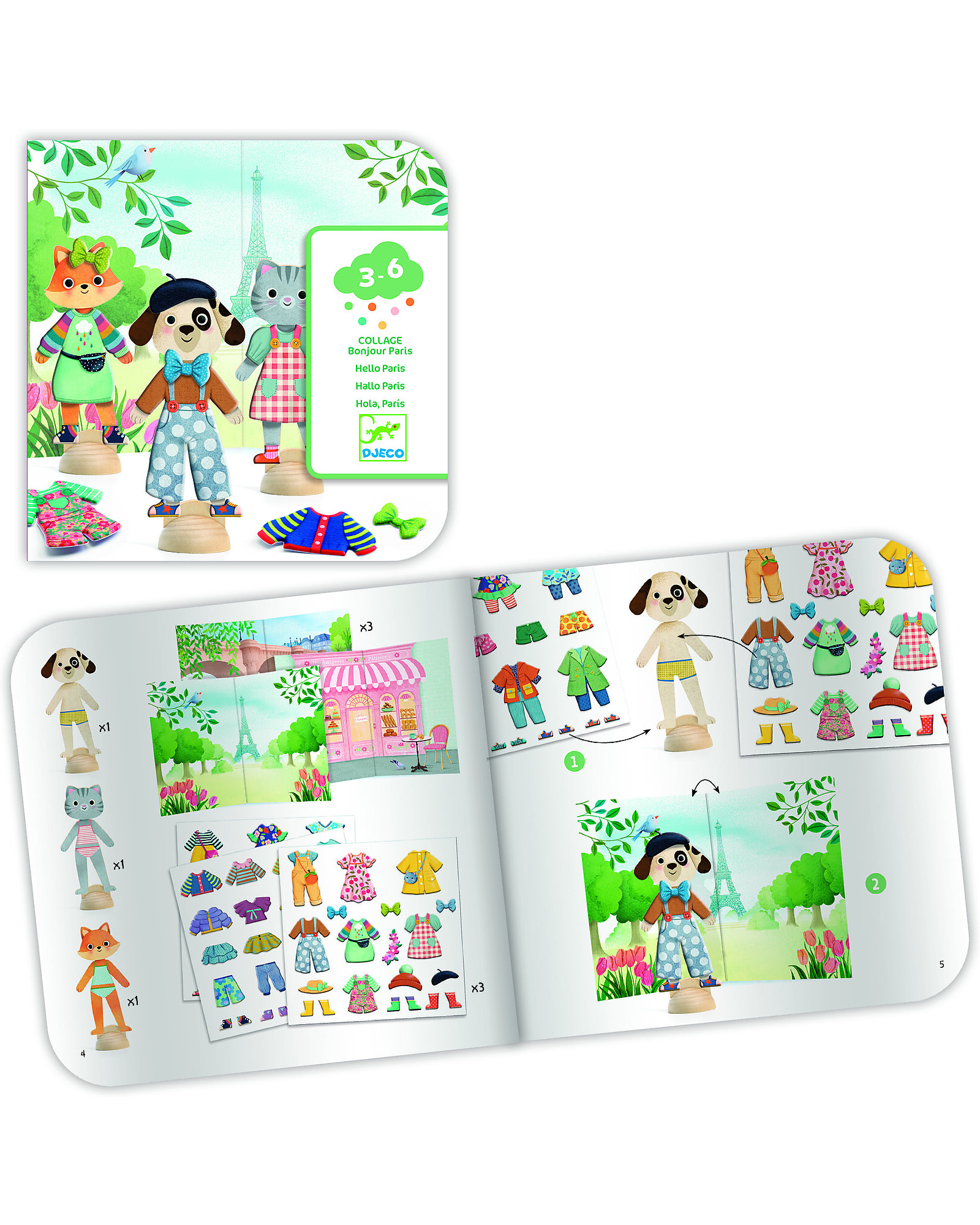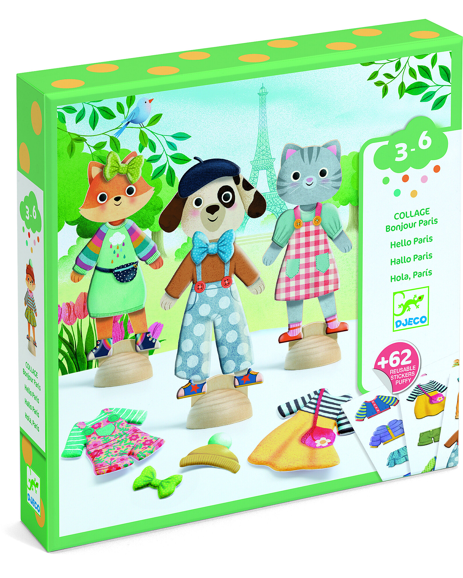 Collage "Ciao Parigi" è un'attività creativa perfetta per i bambini dai 3 anni in su, pensata per stimolare fantasia, manualità e gioco simbolico. I piccoli artisti potranno divertirsi a vestire 3 adorabili personaggi in legno con oltre 45 capi di abbigliamento riposizionabili, da attaccare e staccare tutte le volte che vogliono. Un gioco di collage senza colla né forbici, ideale per sviluppare la motricità fine in totale sicurezza. Ogni personaggio è accompagnato da un design di sfondo stimolante che invita i bambini a inventare storie e creare situazioni sempre nuove. Il kit include anche un libretto illustrato a colori, facile da seguire grazie alle sole immagini, per guidare i più piccoli passo dopo passo. Un’attività divertente, educativa e perfetta per i piccoli sognatori... con un tocco parigino!