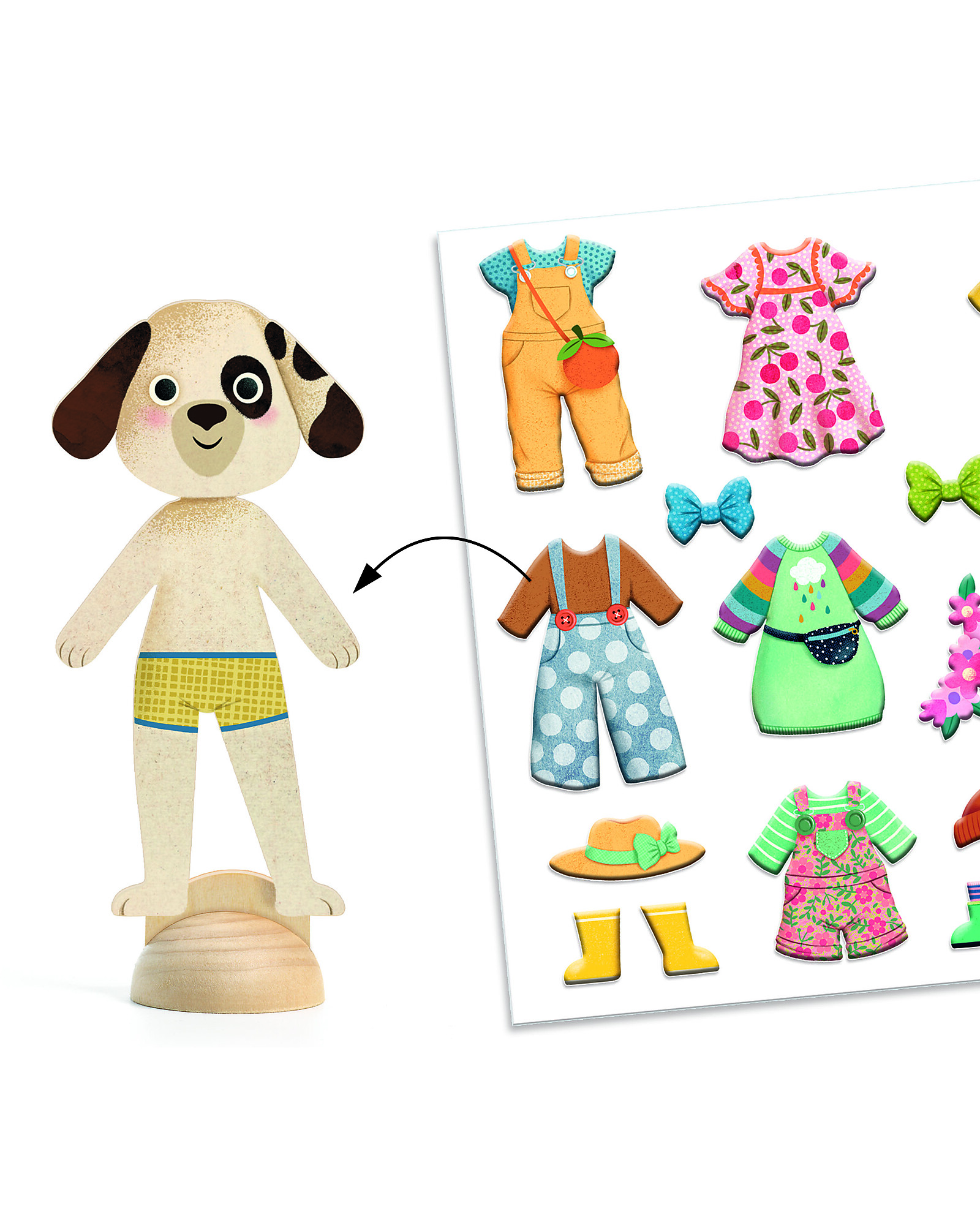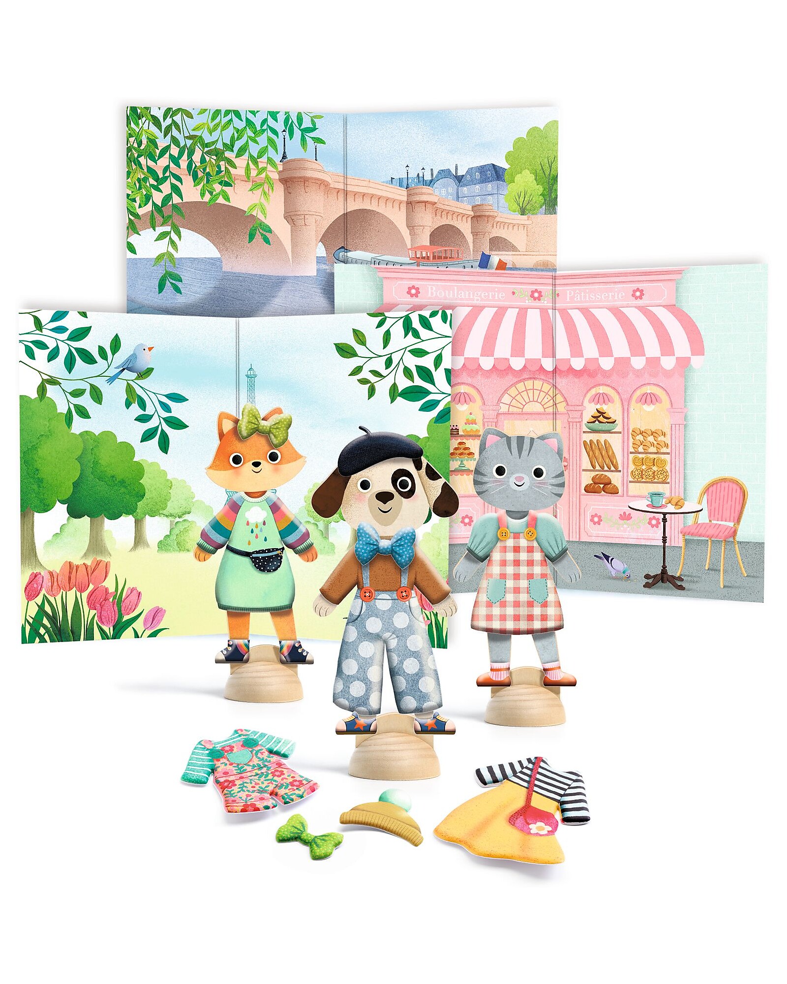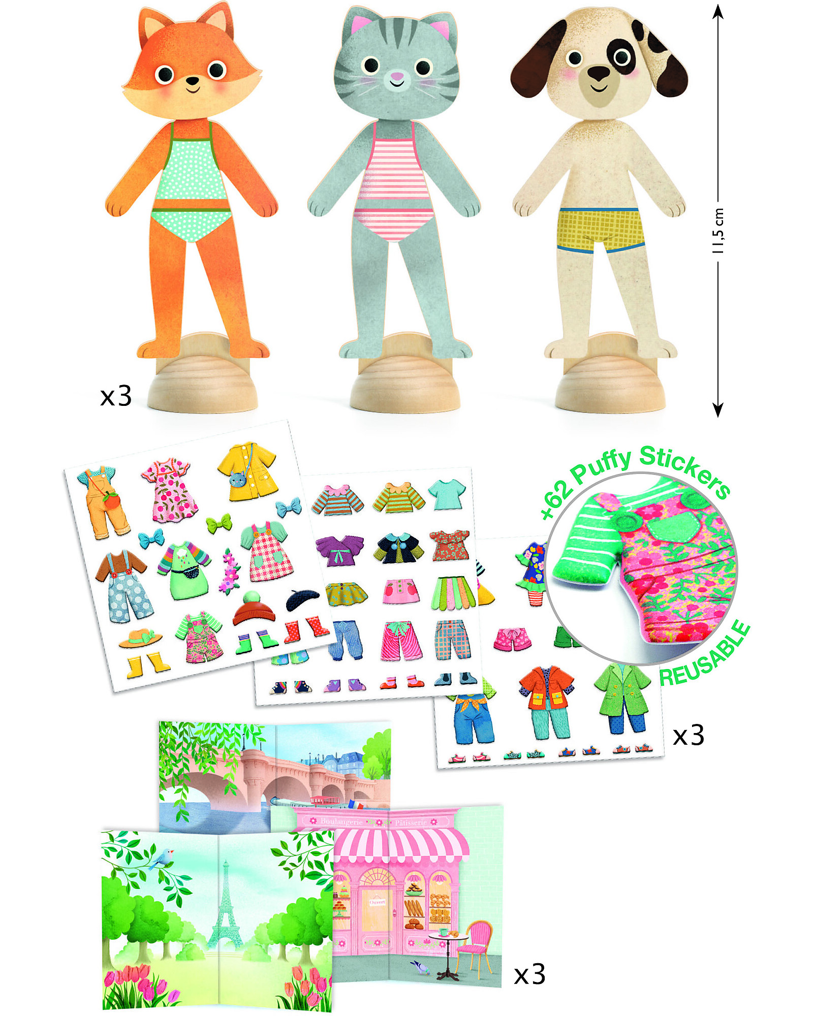 - Include: 3 personaggi in legno con supporto, 45 vestiti riposizionabili, 3 decorazioni in cartone, 1 libretto di istruzioni