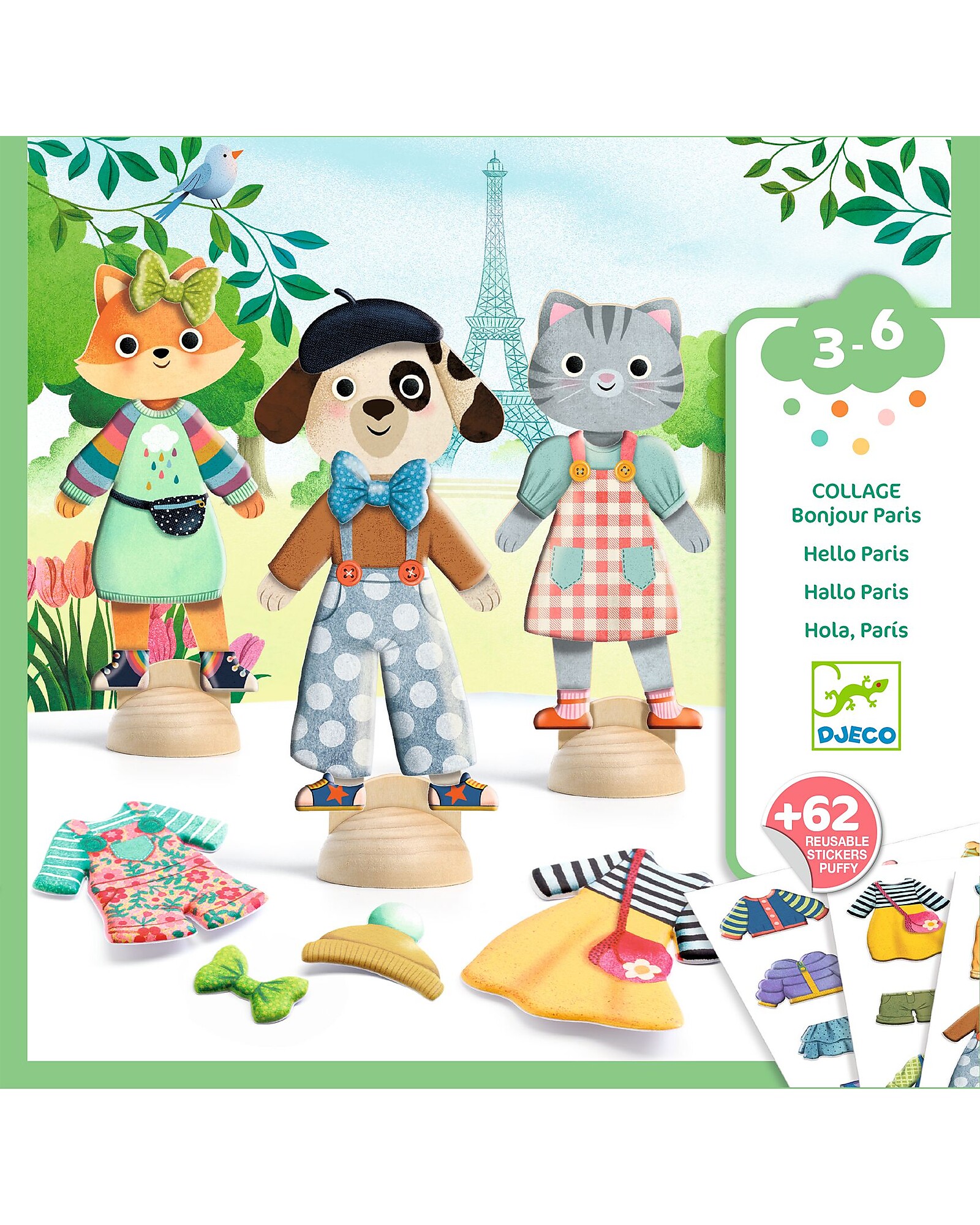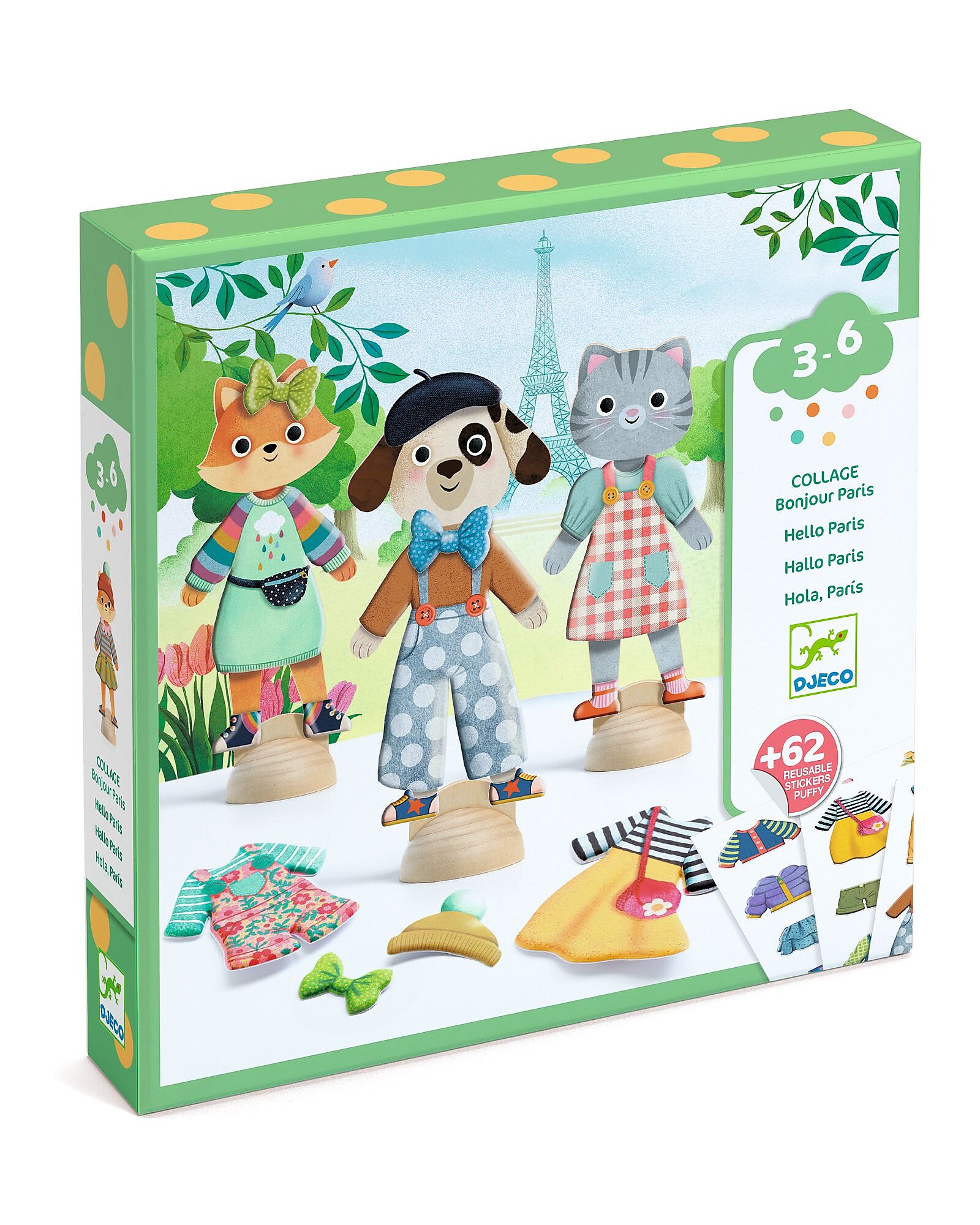 Collage "Ciao Parigi" è un'attività creativa perfetta per i bambini dai 3 anni in su, pensata per stimolare fantasia, manualità e gioco simbolico. I piccoli artisti potranno divertirsi a vestire 3 adorabili personaggi in legno con oltre 45 capi di abbigliamento riposizionabili, da attaccare e staccare tutte le volte che vogliono. Un gioco di collage senza colla né forbici, ideale per sviluppare la motricità fine in totale sicurezza. Ogni personaggio è accompagnato da un design di sfondo stimolante che invita i bambini a inventare storie e creare situazioni sempre nuove. Il kit include anche un libretto illustrato a colori, facile da seguire grazie alle sole immagini, per guidare i più piccoli passo dopo passo. Un’attività divertente, educativa e perfetta per i piccoli sognatori... con un tocco parigino!