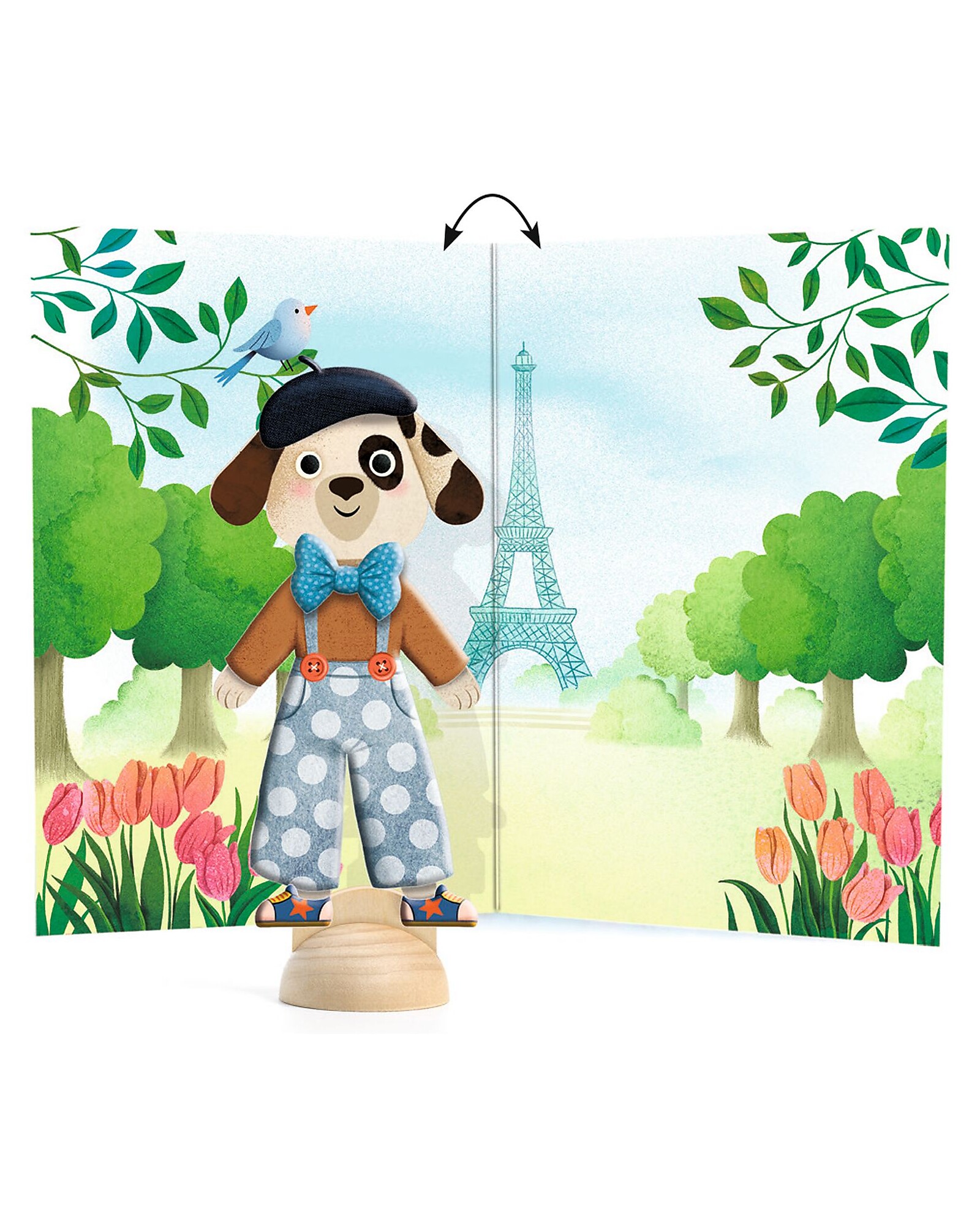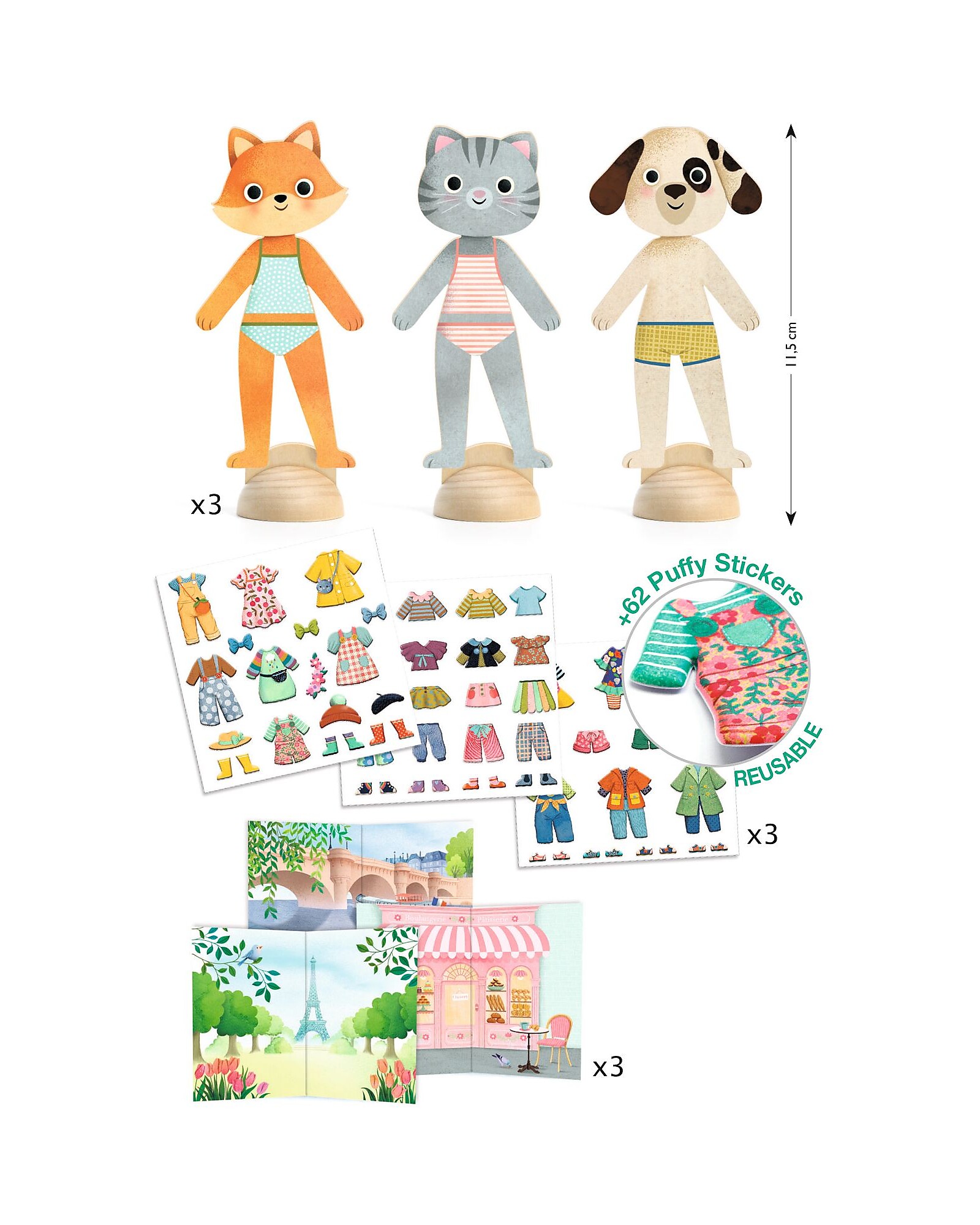 - Include: 3 personaggi in legno con supporto, 45 vestiti riposizionabili, 3 decorazioni in cartone, 1 libretto di istruzioni