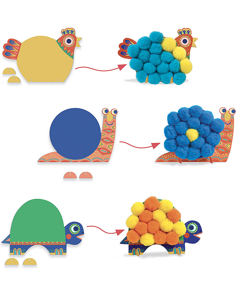 Se sei alla ricerca di un'attività che metta all'opera il tuo bambino e che sia piena di amore, tenerezza, ma che sia anche educativa, ecco una splendida attività di collage realizzato dal marchio francese Djeco. Quest'attività permetterà al vostro bambino di completare 3 immagini di animali aggiungengo grandi pompons colorati! Gli animali presentano delle parti adesive che possono essere rallegrate in modo facile e veloce e senza sporcarsi!