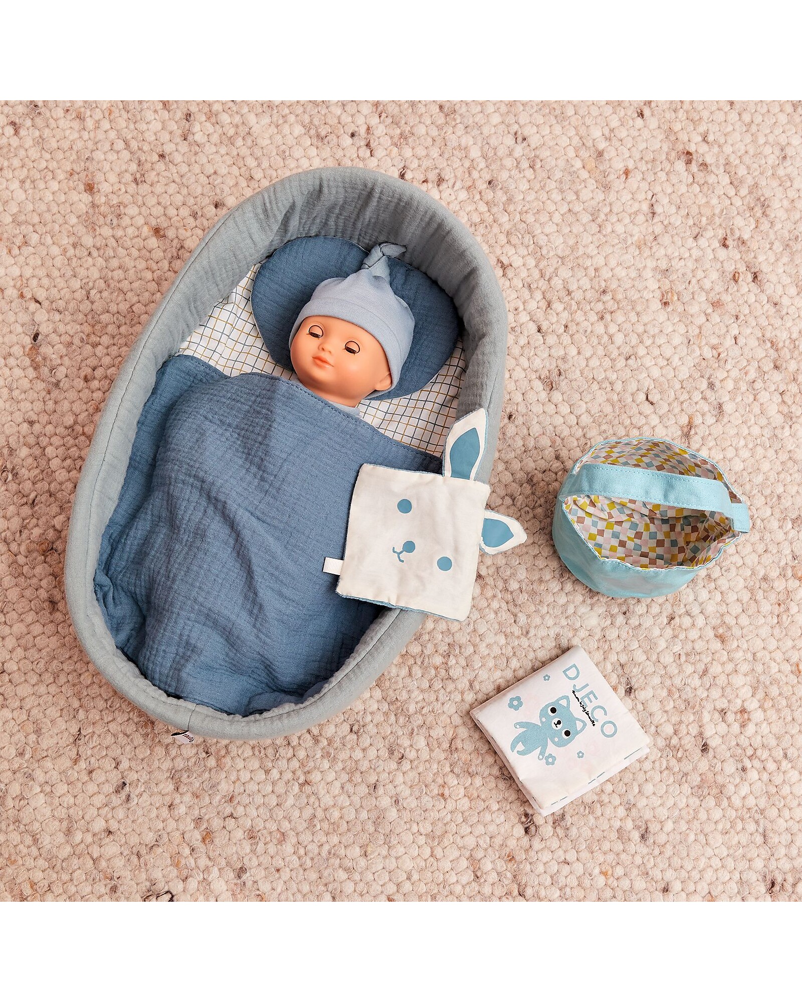 Si tratta di una culla a dondolo ricoperta da una fodera trapuntata blu in doppia garza di cotone 100%. Con il cuscino e la morbida coperta, la bambola è a suo agio e pronta per addormentarsi serenamente, cullata dai suoi piccoli genitori.