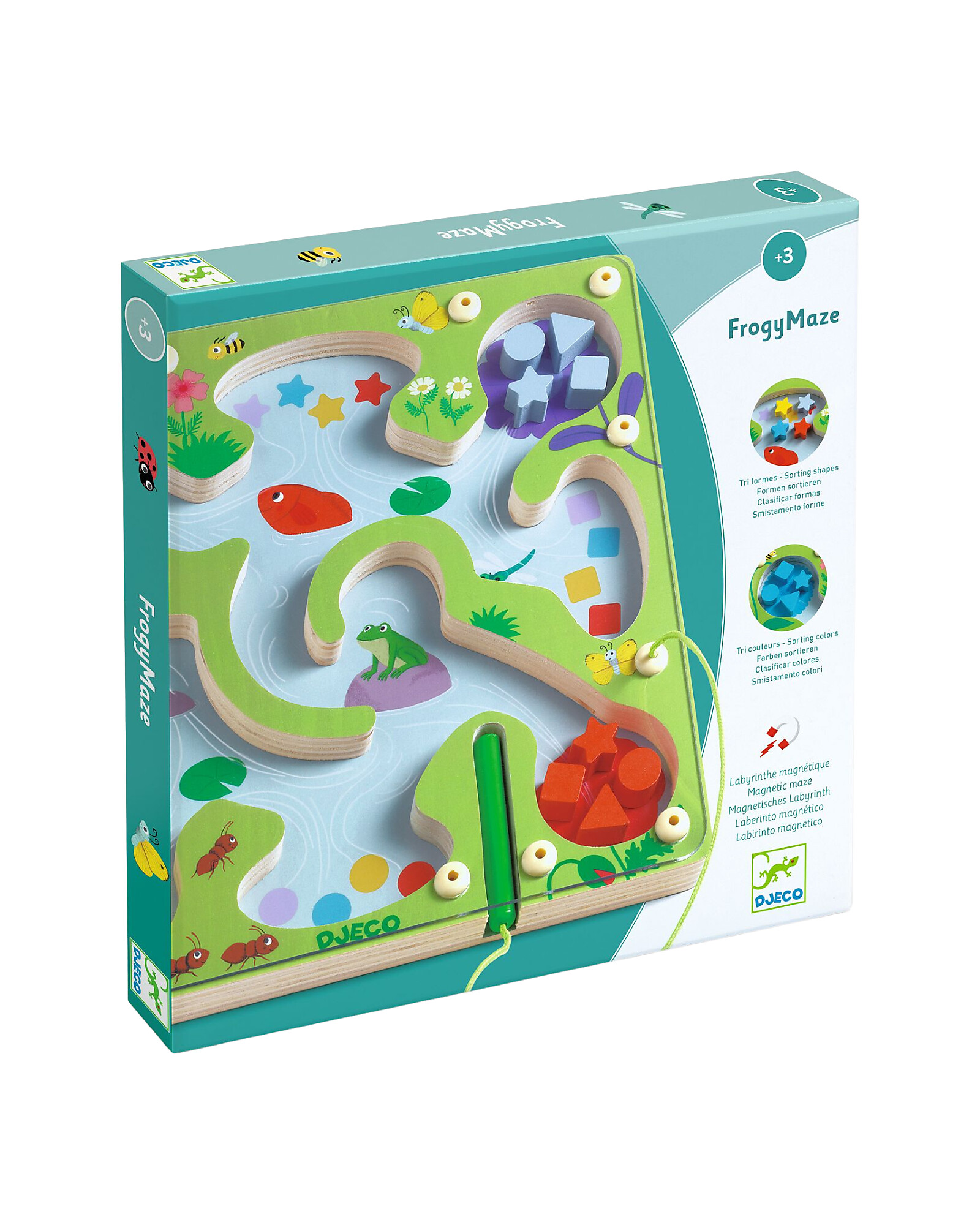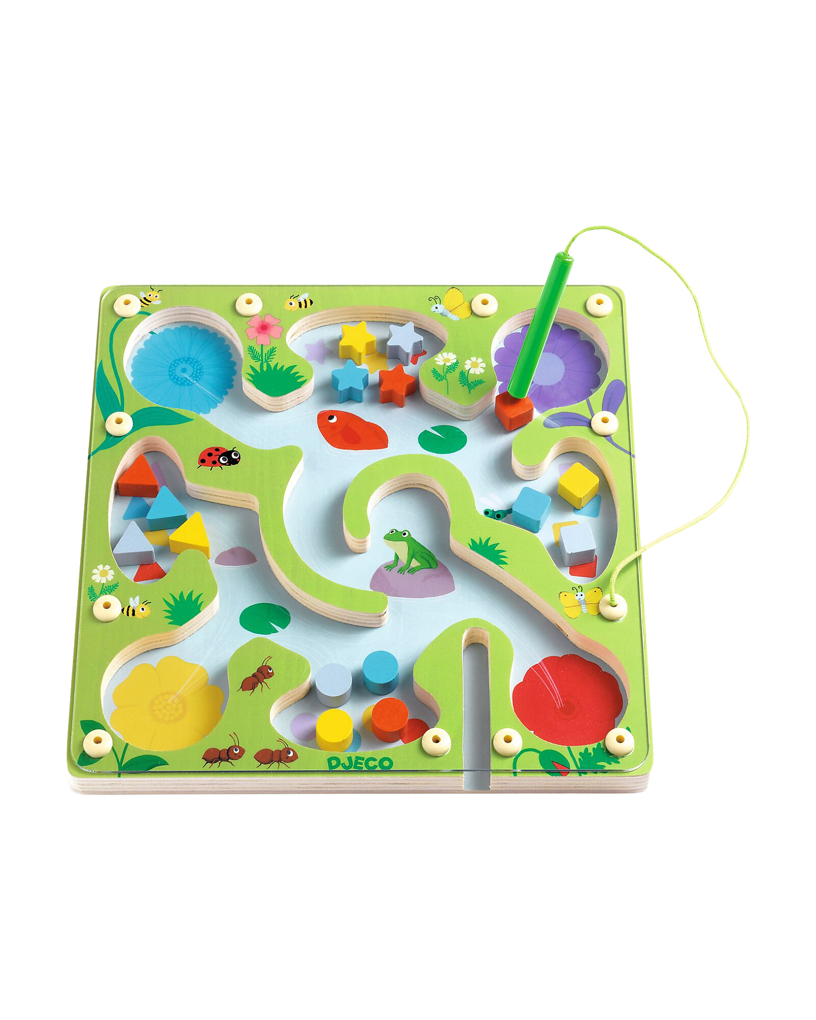 Il Labirinto Magnetico FrogyMaze di Djeco è un gioco da viaggio perfetto per piccoli esploratori dai 3 anni. Con la penna magnetica, i bambini guidano i 16 pezzi in legno FSC® attraverso il labirinto, posizionandoli nelle 8 caselle secondo colori e forme. I fiori colorati aiutano a individuare subito la destinazione giusta, trasformando ogni percorso in una sfida divertente e educativa. Ideale per stimolare coordinazione mano-occhio, logica e riconoscimento visivo. Compatto e resistente, è il compagno ideale per giocare ovunque con fantasia e concentrazione.