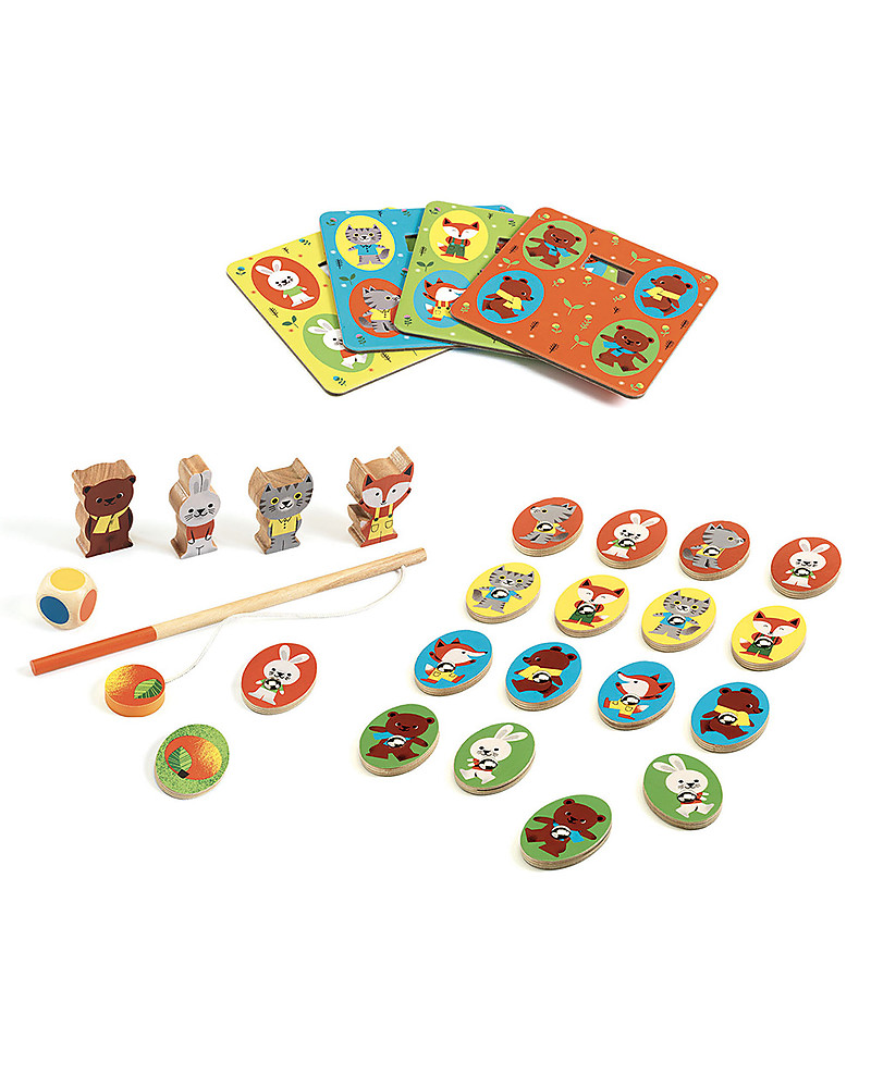 Il gioco da tavolo Ludo realizzato da Djeco contiene non uno ma ben 4 giochi diversi per tutta la famiglia! Il primo gioco è un set magnetico per la pesca che vi permetterà di raccogliere tante mini figure di simpatici personaggi con l'aiuto della canna. Altro gioco classico incluso all'interno del cofanetto è il memo, rallegrato da simpatici e divertenti animali che vanno abbinati l'uno con l'altro. Il gioco della tombola, è composto da 4 cartelle che raffigurano non numeri, ma disegni che devono essere completati per vincere! Infine il gioco Roll-and-Move include l'utilizzo di un dado per poter muovere il proprio personaggio nel tabellone.