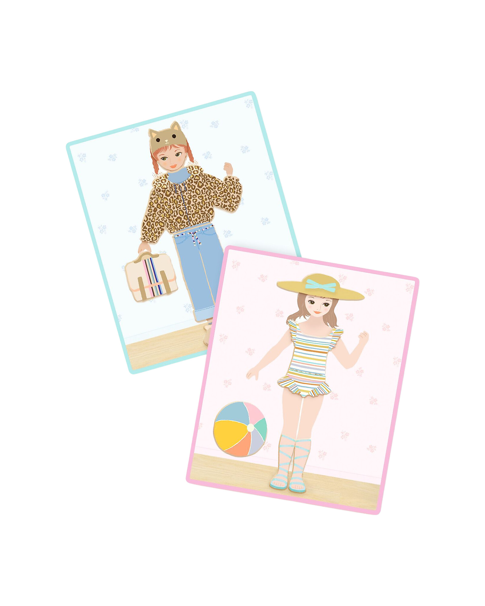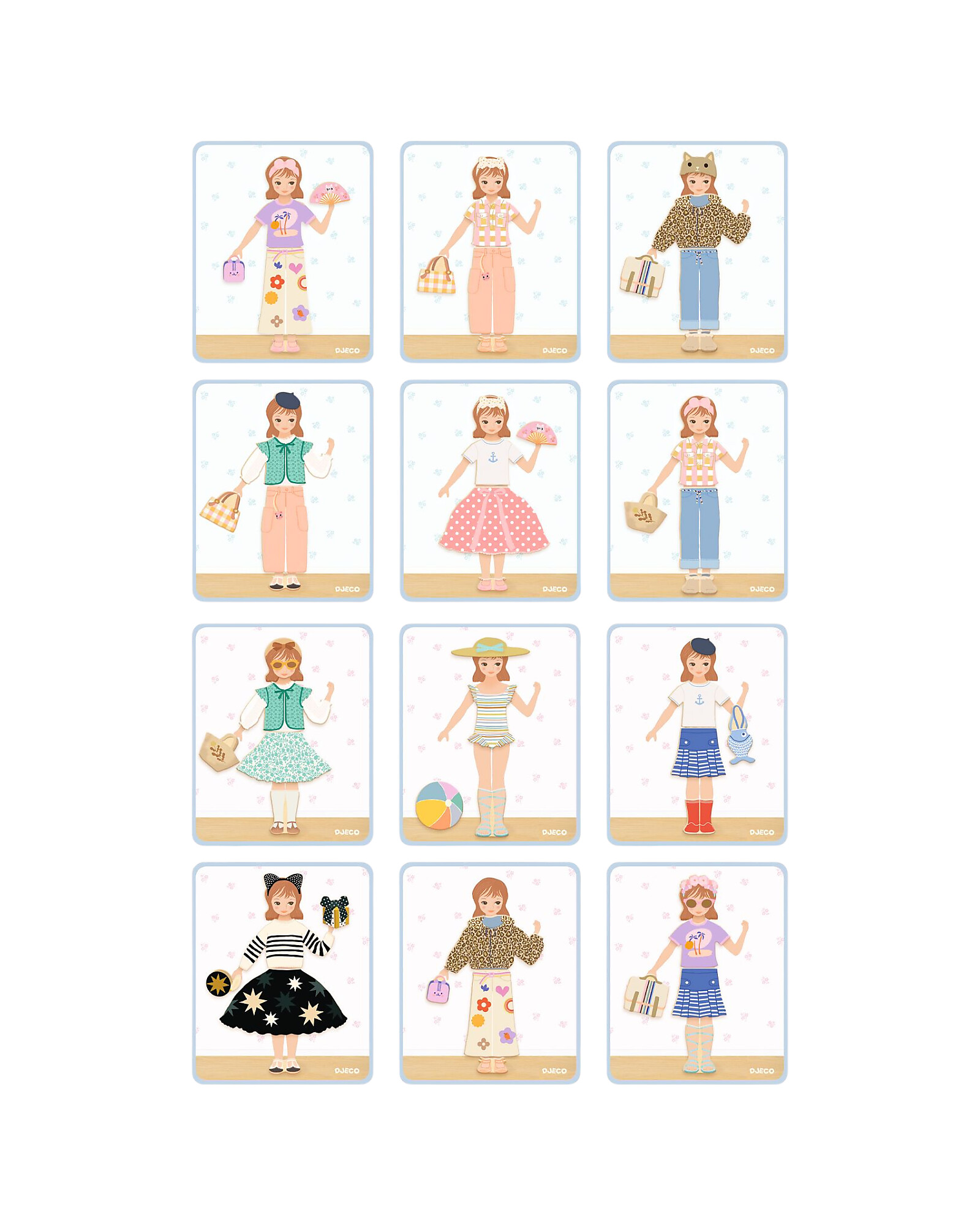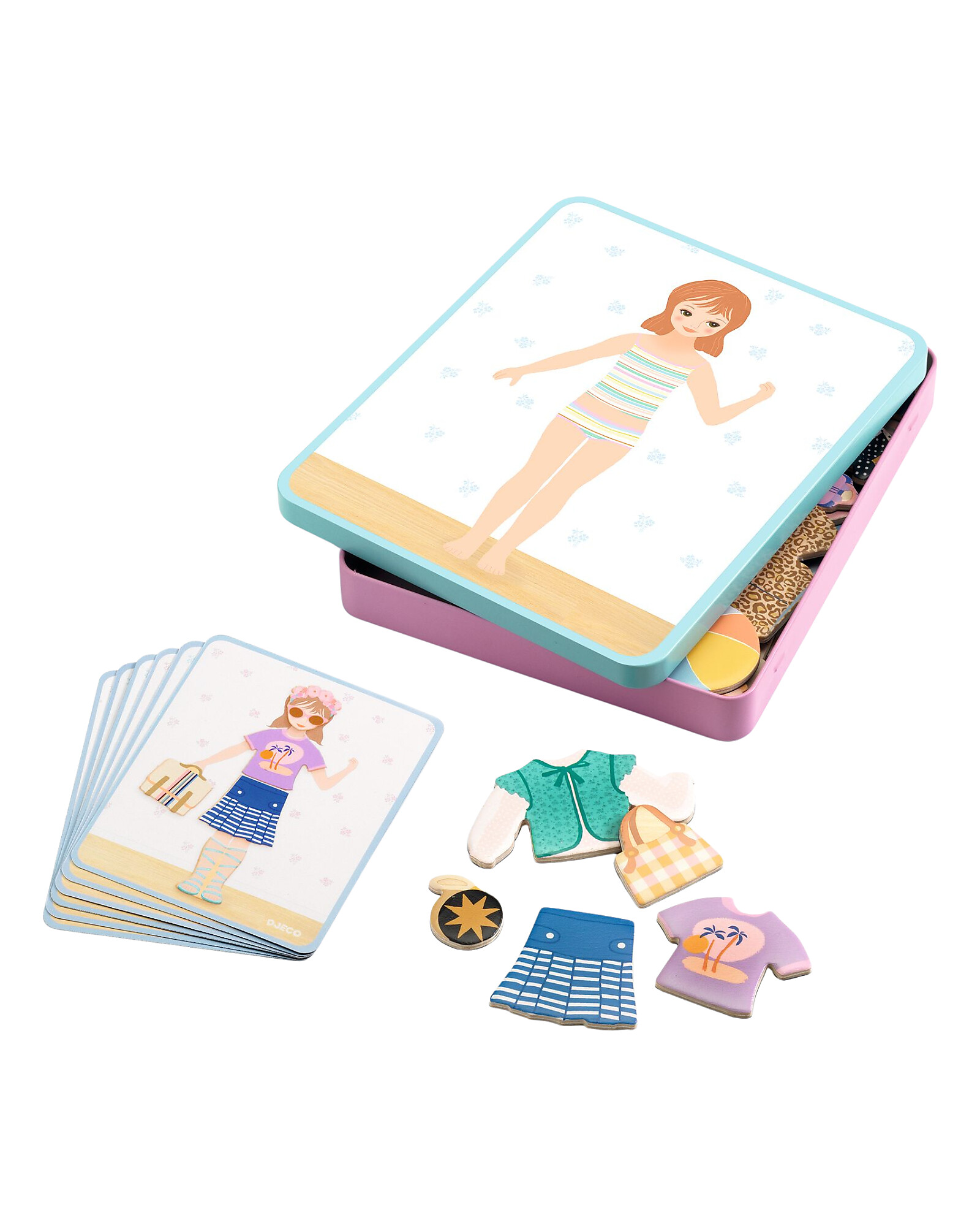 - Include: 1 scatola metallica sottile e illustrata fronte/retro, 38 pezzi magnetici in legno (vestiti, accessori, teste, scarpe, borse, cappelli…), 6 carte modello fronte/retro per un totale di 12 outfit