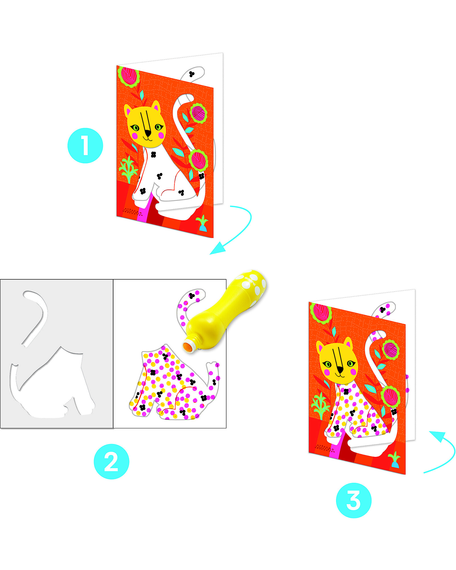 Un kit creativo perfetto per le prime esperienze artistiche! Questo set è pensato per i bambini dai 18 mesi in su e offre un’attività divertente e stimolante, ideale per sviluppare la motricità fine e la creatività in tutta sicurezza. Con i 4 grandi pennarelli mousse, facili da impugnare e sicuri per i più piccoli, i bambini decorano punto dopo punto le 4 tavole illustrate e sagomate, creando effetti grafici colorati semplicemente sovrapponendo o affiancando i pois. L’inchiostro è lavabile e non macchia, per un’esperienza di gioco serena e senza pensieri.