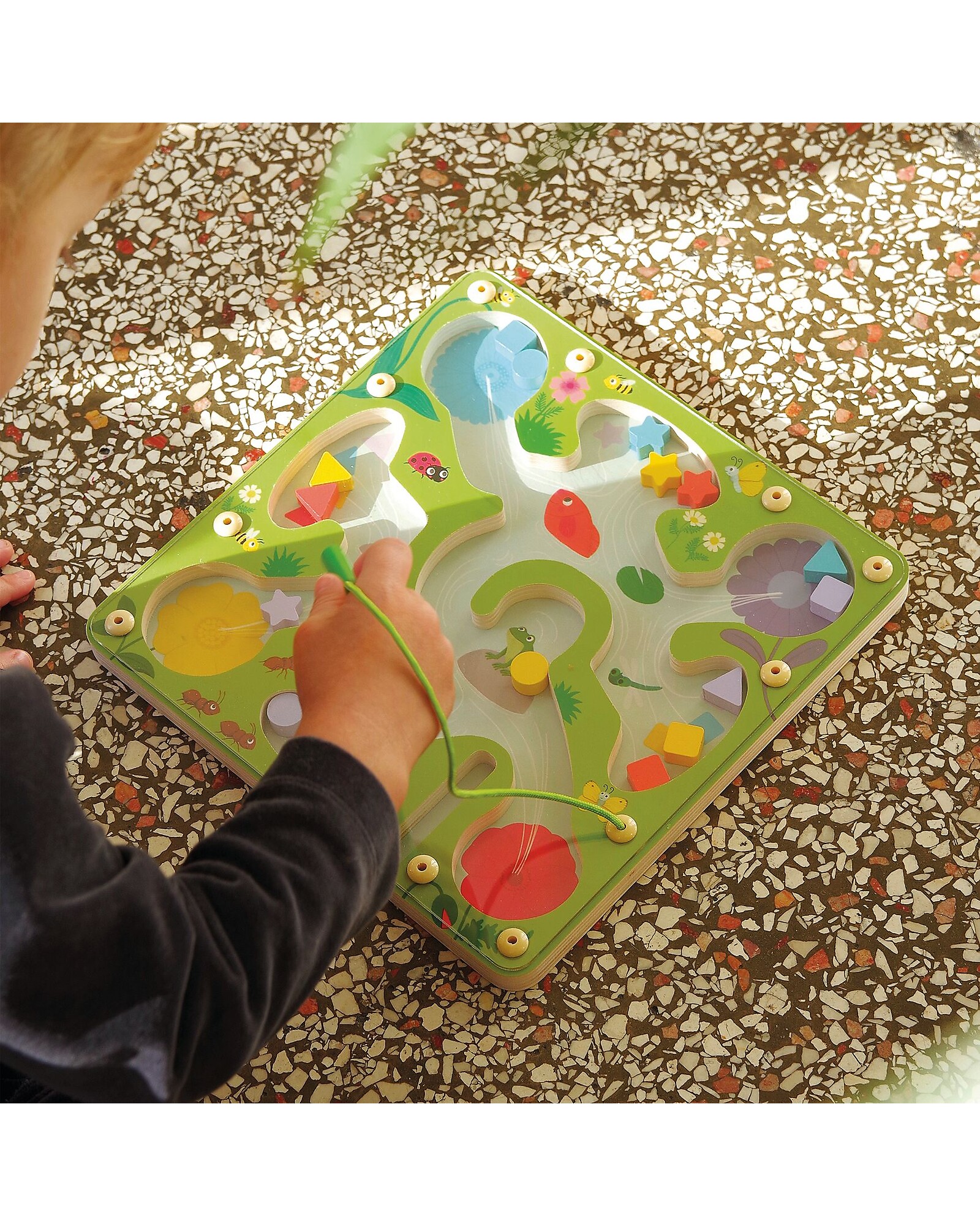 Il Labirinto Magnetico FrogyMaze di Djeco è un gioco da viaggio perfetto per piccoli esploratori dai 3 anni. Con la penna magnetica, i bambini guidano i 16 pezzi in legno FSC® attraverso il labirinto, posizionandoli nelle 8 caselle secondo colori e forme. I fiori colorati aiutano a individuare subito la destinazione giusta, trasformando ogni percorso in una sfida divertente e educativa. Ideale per stimolare coordinazione mano-occhio, logica e riconoscimento visivo. Compatto e resistente, è il compagno ideale per giocare ovunque con fantasia e concentrazione.