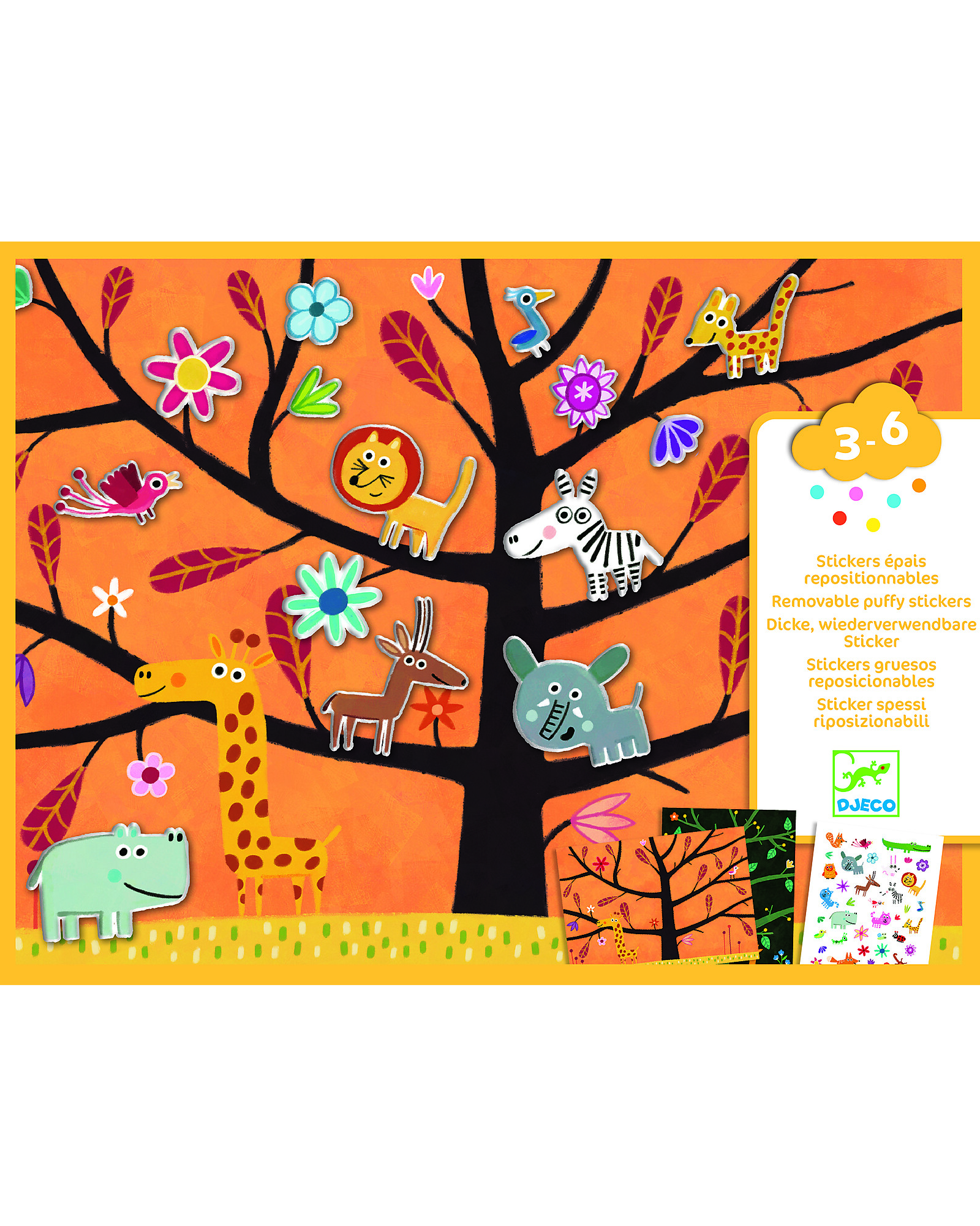 Il set Djeco Puffy Stickers – Off-Ground Tag! include adesivi 3D super morbidi distribuiti su due fogli. Questi adesivi "puffy" sono perfetti per le manine dei più piccoli, perché possono staccarli e attaccarli da soli in totale autonomia. Ideali per decorare qualsiasi superficie a portata di mano! Il set include anche 2 diversi sfondi ad albero da personalizzare – uno per il giorno e uno per la notte!