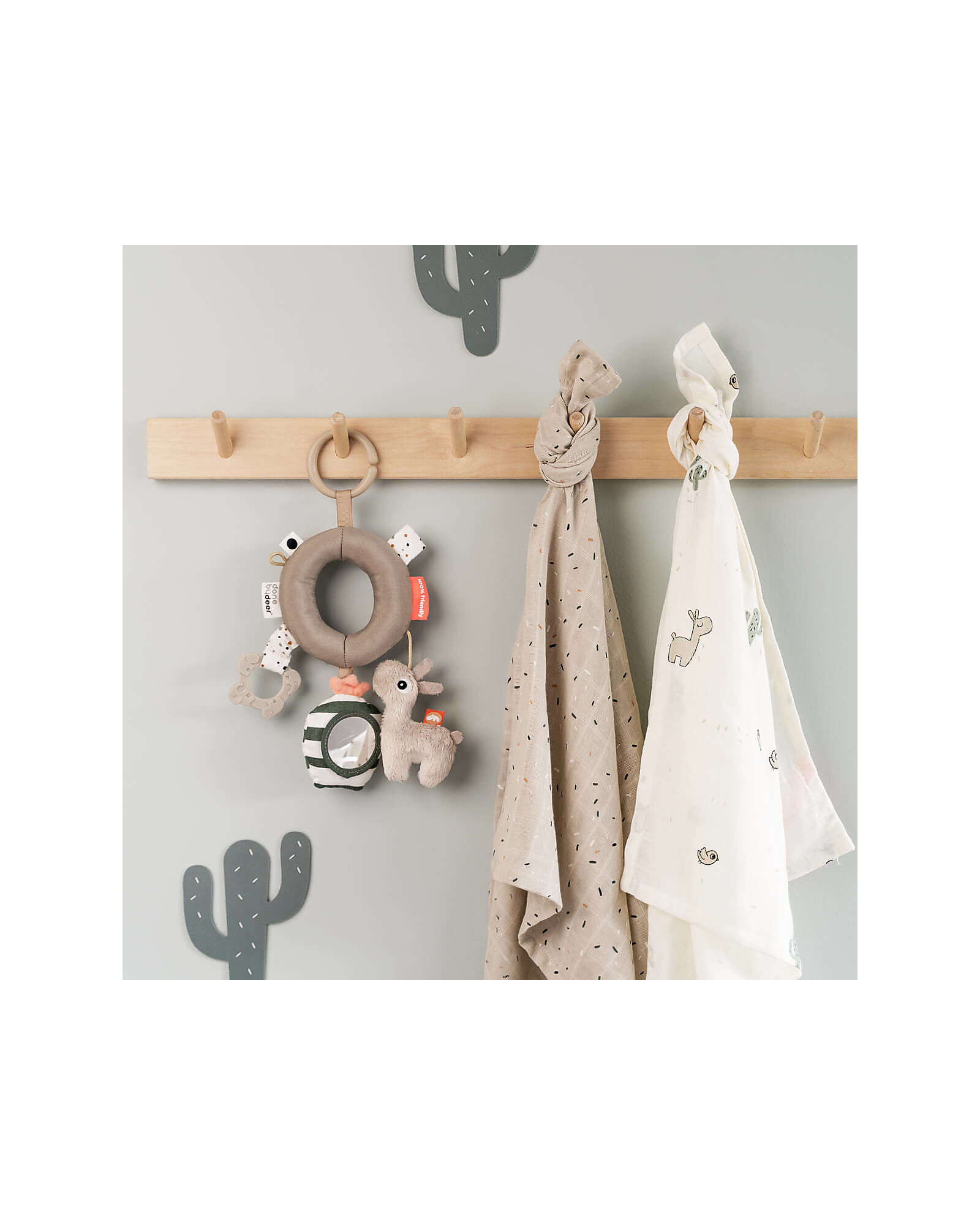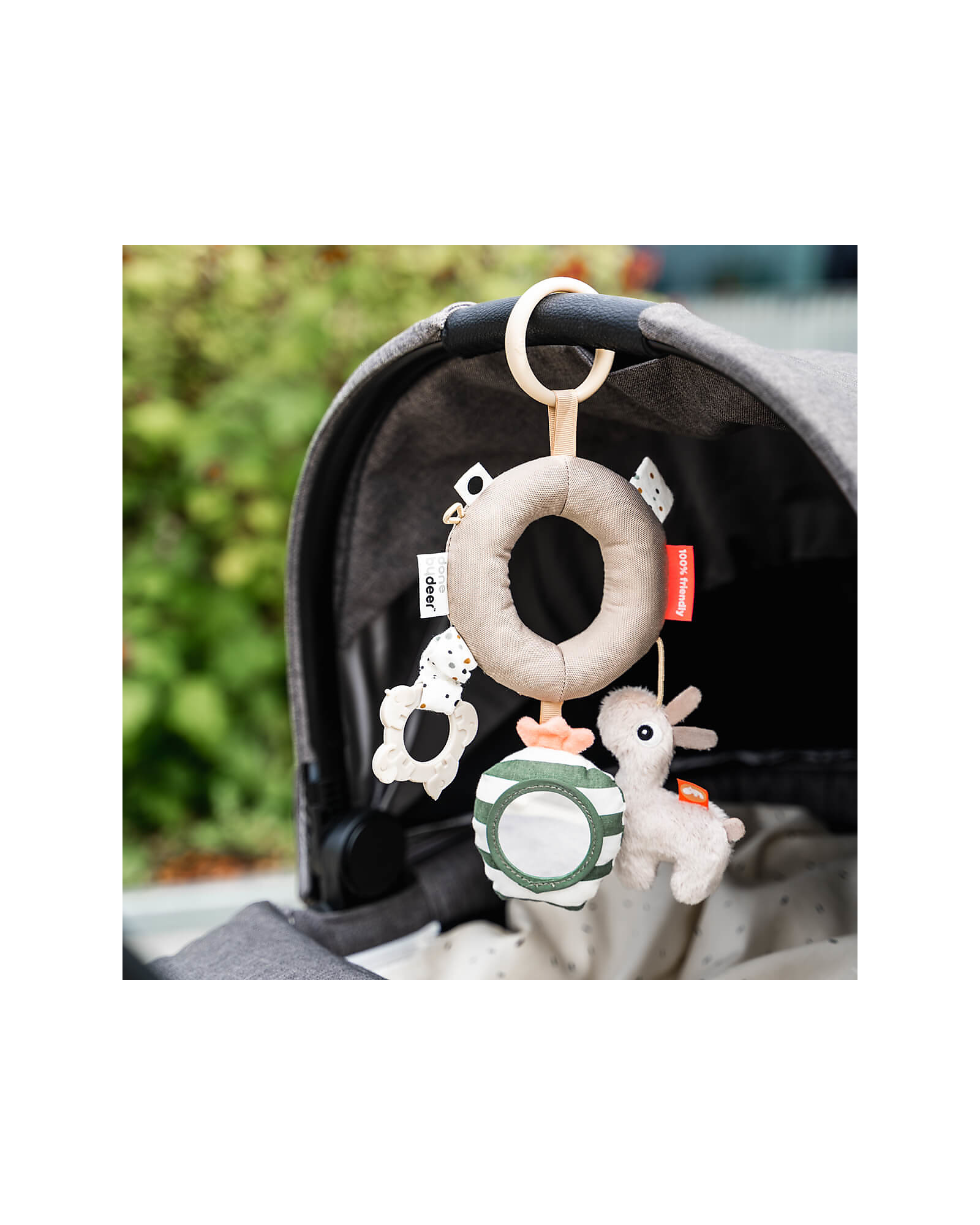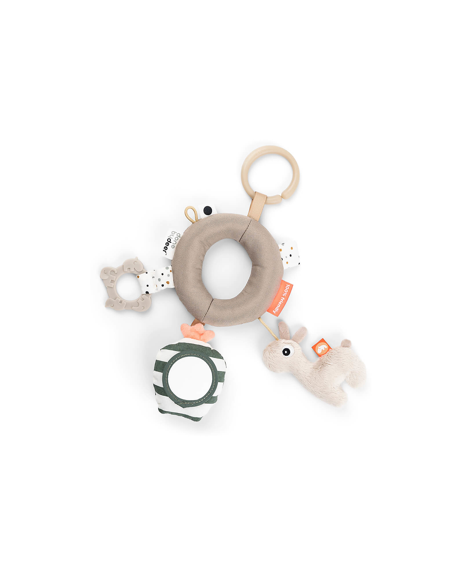 Entra nell'anello del divertimento con il gioco multisensoriale del marchio danese Done By Deer. L'anello di Attività Multisensoriale è stato ideato per fare divertire il bebè e aiutarlo a sviluppare abilità motorie e cognitive. Tutti i sensi sono coinvolti! Gli occhi del tuo bimbo verranno attratti dai colori nelle tonalità del rosa, le texture differenti sono pensate per sviluppare il senso del tatto, lo specchietto sonaglio stimola l'udito con dolci suoni mentre il pancino dell'animaletto scricchiola quando viene premuto. Ha persino un massaggiagengive da mordicchiare per alleviare il fastidio alle gengive durante la dentizione e uno specchietto in cui vedrà rifessa la propria immagine. In più è possibile aggiungere un ciuccio o il giochino preferito del piccolo nell'anello libero! Facilissima da afferrare per le mani di un bèbè, questo splendido gioco di attività può anche essere appeso al passeggino, al seggiolino auto, alla culla, alla palestrina, ed ovunque ci sia voglia di giocare e scoprire!