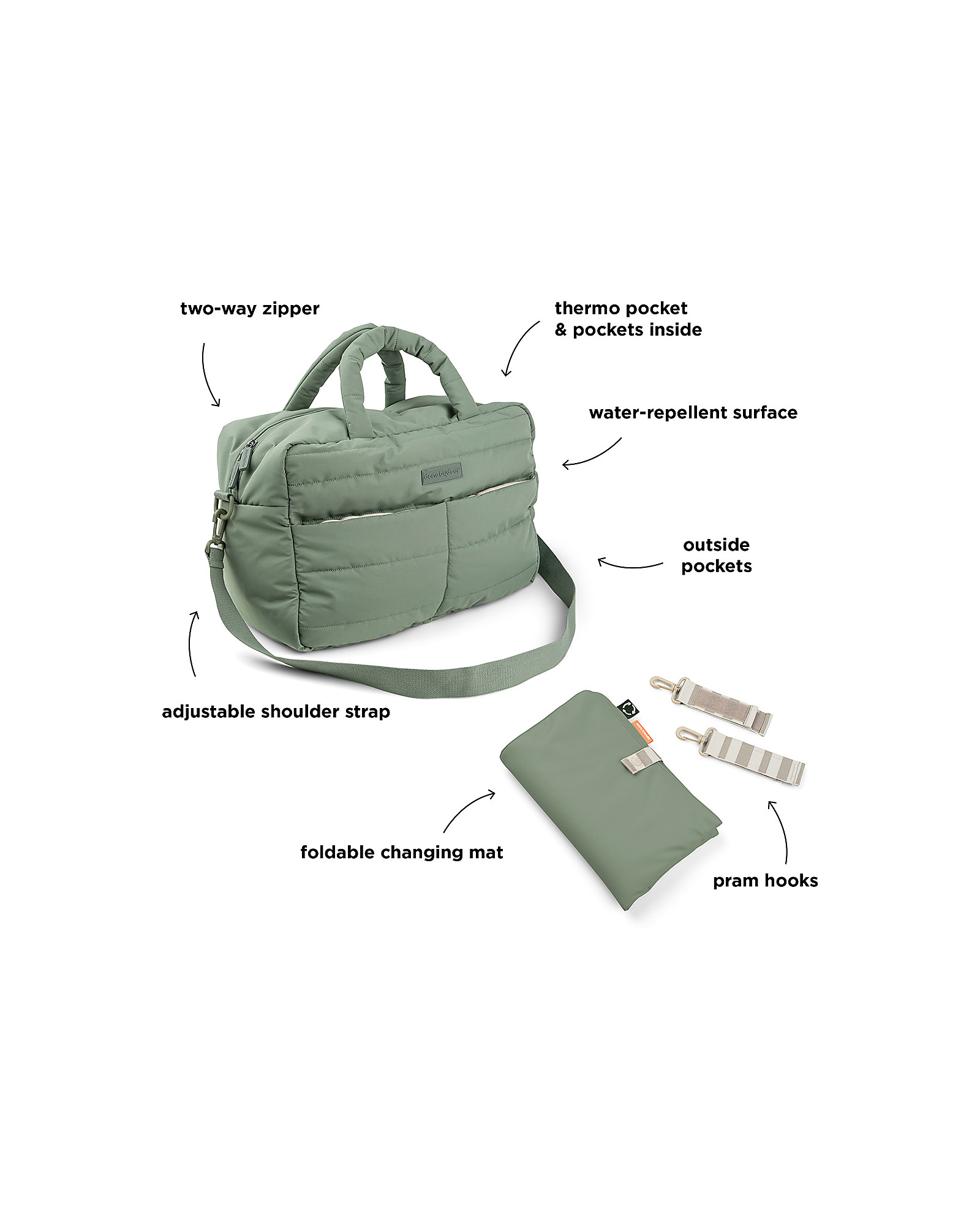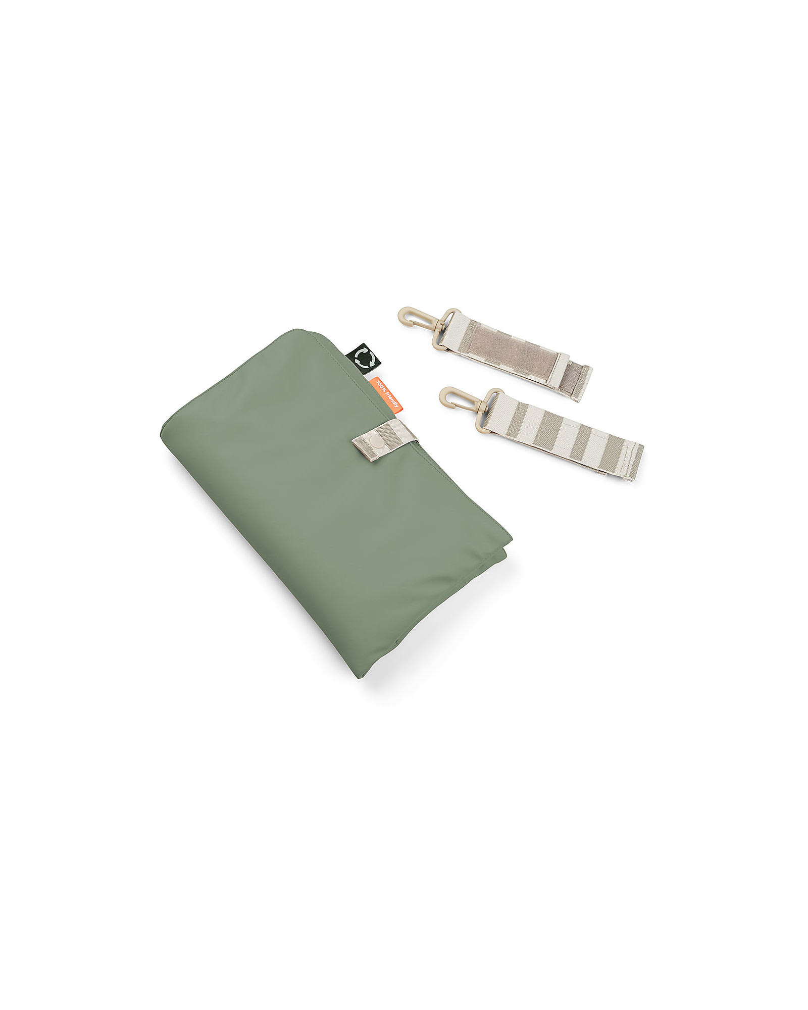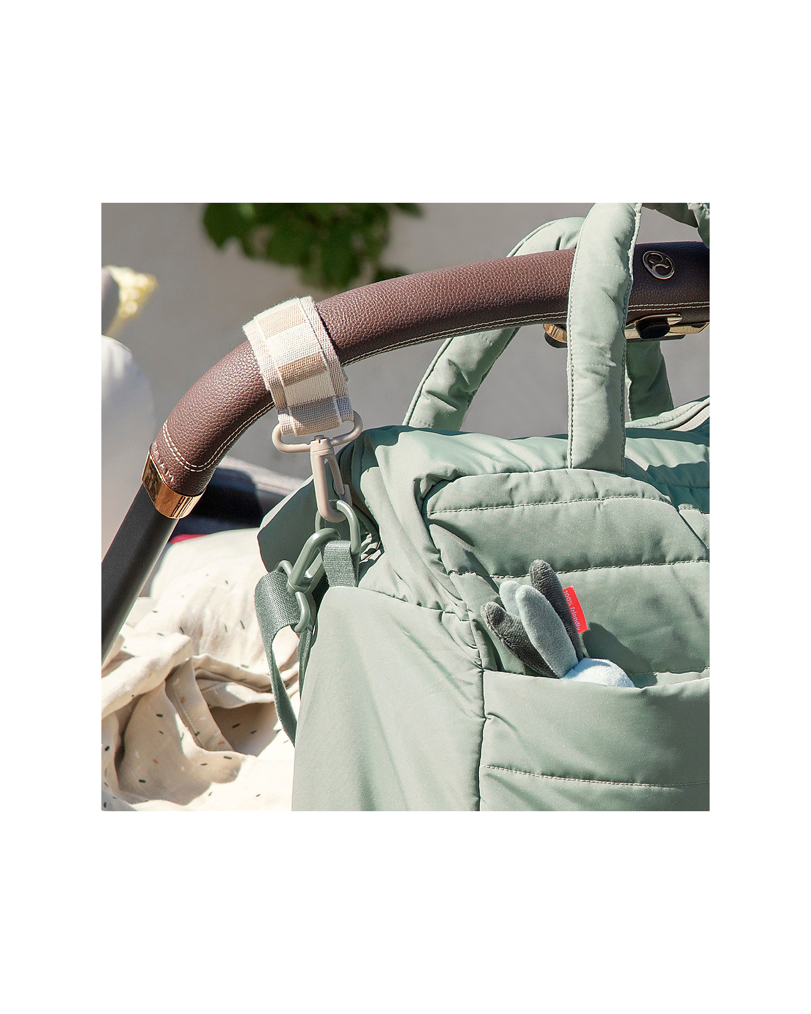 La borsa ha una tasca termica interna per mantenere una bottiglia sia calda che fredda, è impermeabile e sono realizzati al 100% in poliestere riciclato da un totale di 48 bottiglie in PET. Le cinghie all'esterno facilitano il fissaggio della borsa al passeggino.
