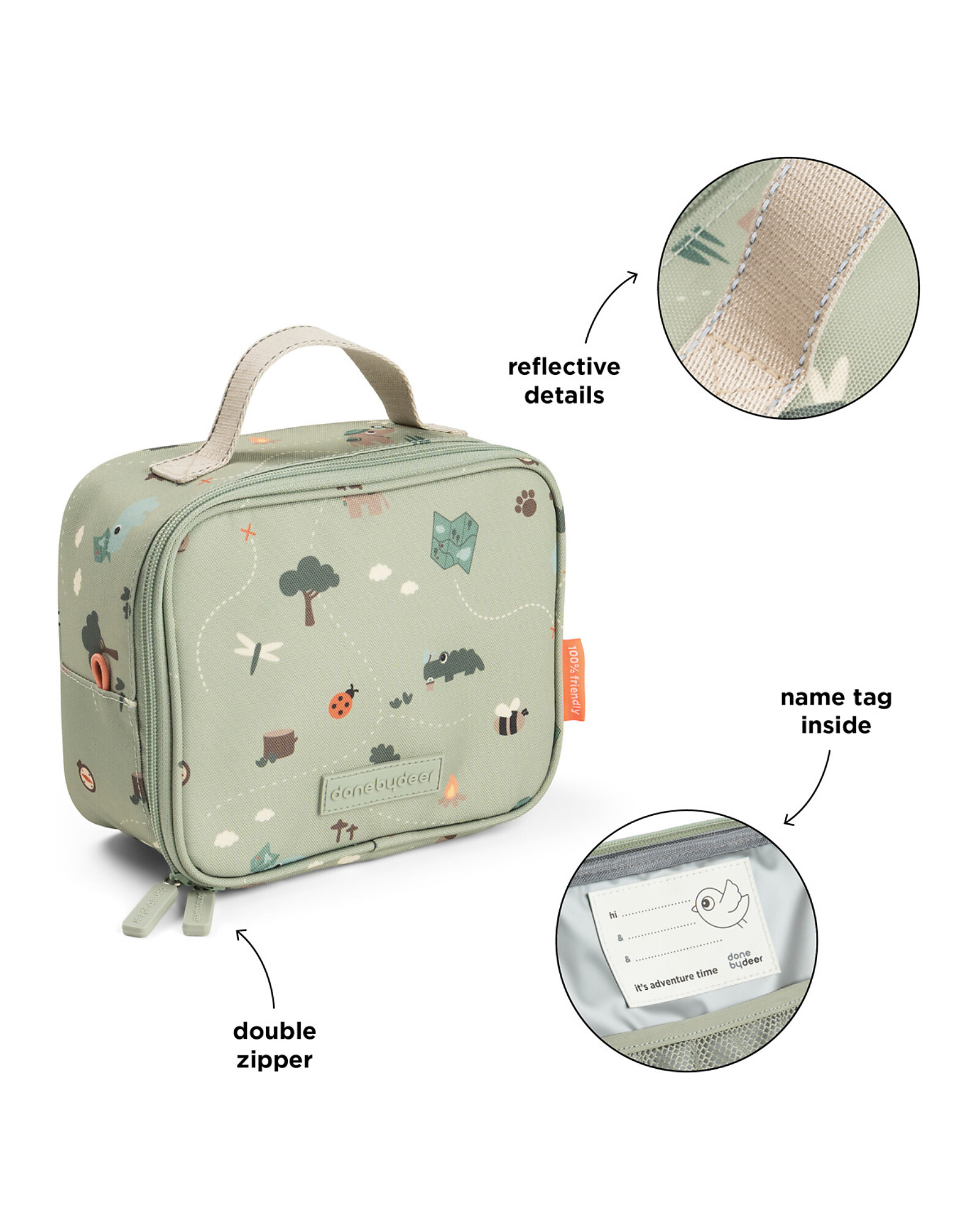 Il grande scomparto principale con tasca in rete è perfetto per inserire ghiaccioli refrigeranti o piccoli snack, mentre le due zip con apertura facilitata garantiscono accesso semplice e veloce. Il dettaglio riflettente sulla maniglia migliora la visibilità e il name tag interno permette di identificarla facilmente.