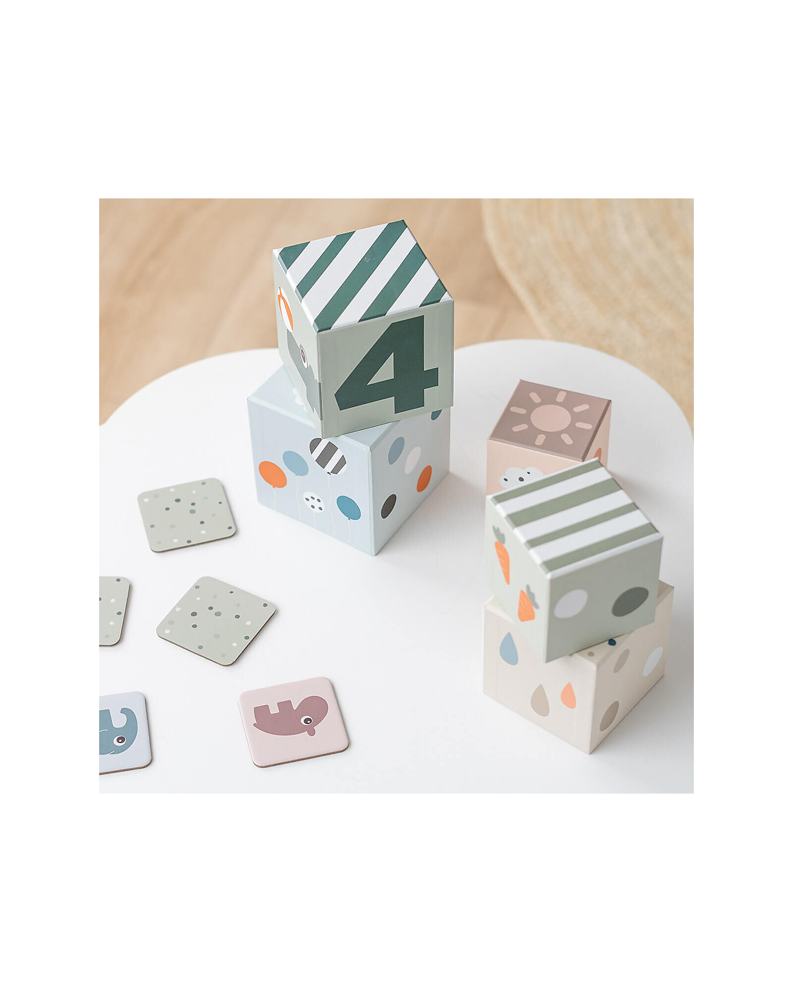 - 5 cubi impilabili di diverse dimensioni, da 7x7 cm a 13x13 cm, in un mix di colori tenui