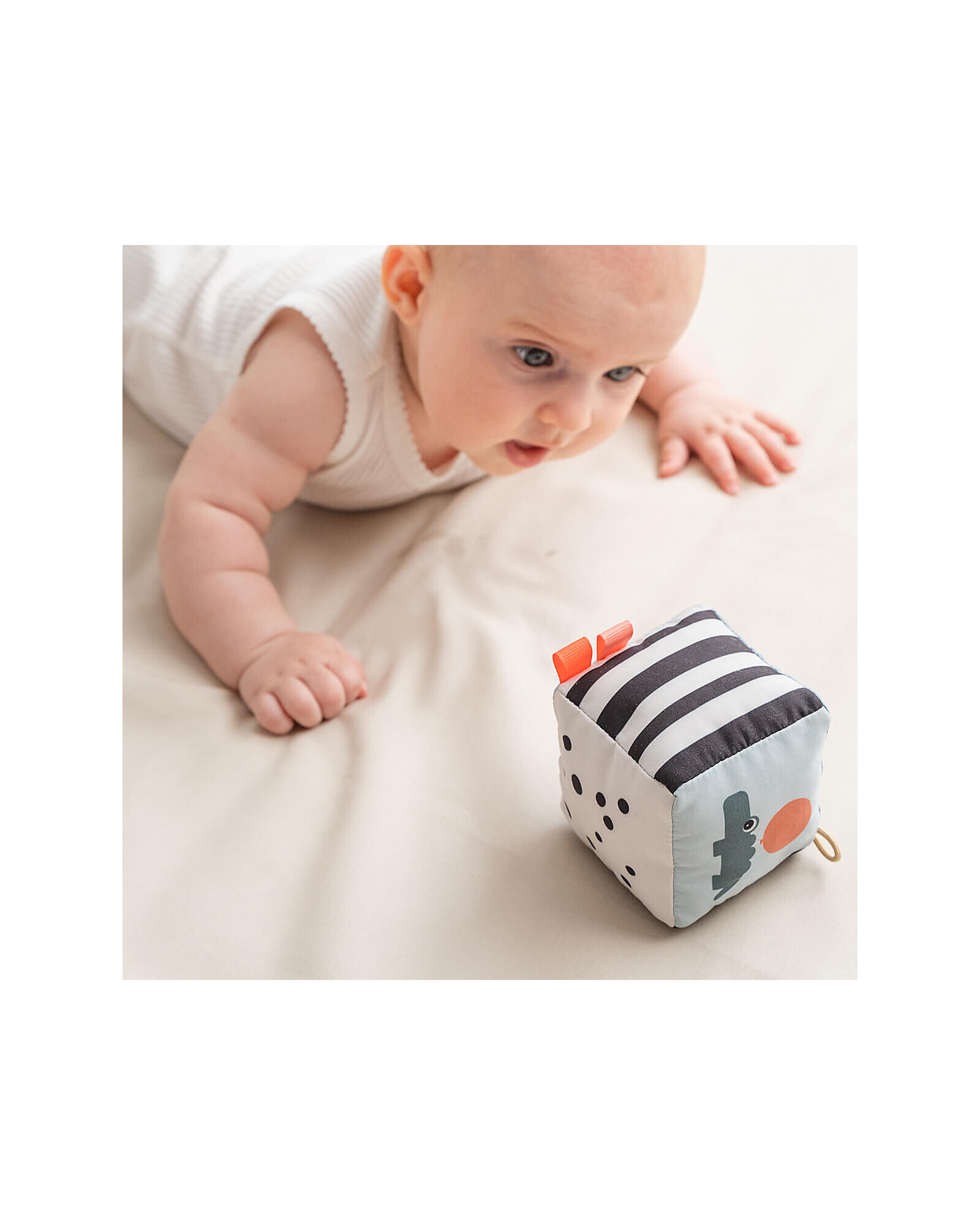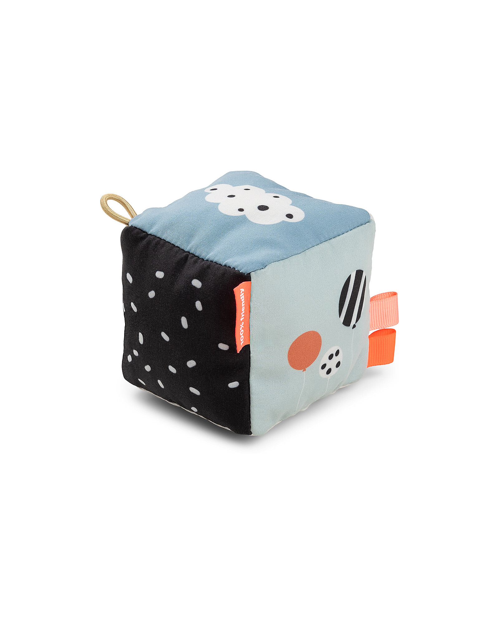 Il Cubo in Tessuto di Done By Deer è un gioco coloratissimo e divertente! Ogni lato è decorato con disegni pensati per stimolare la curiosità e la fantasia del vostro piccolo e all'interno sono presenti divertentissimi sonagli. Realizzato in poliestere e fibre di poliestere, questo cubo è pensato per essere il compagno perfetto durante i momenti di gioco e di coccole oltre che per essere portato in giro grazie al comodo gancio di cui è dotato.