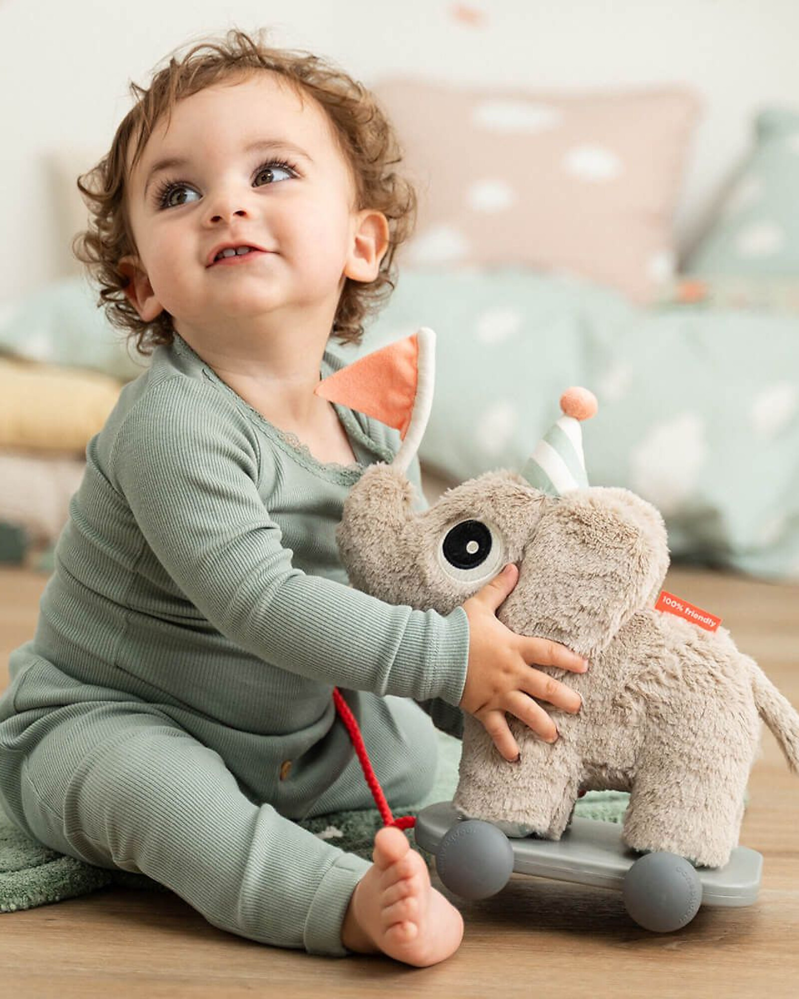 Il gioco da tirare Elphee è un intelligente giocattolo 2-in-1 che inizia come un giocattolo da trainare con piedini magnetici intelligenti che si attaccano facilmente al carro. Quando le gambe del piccolo si stancano, Elphee può essere rapidamente staccato dal carro e trasformato in un dolce peluche.
