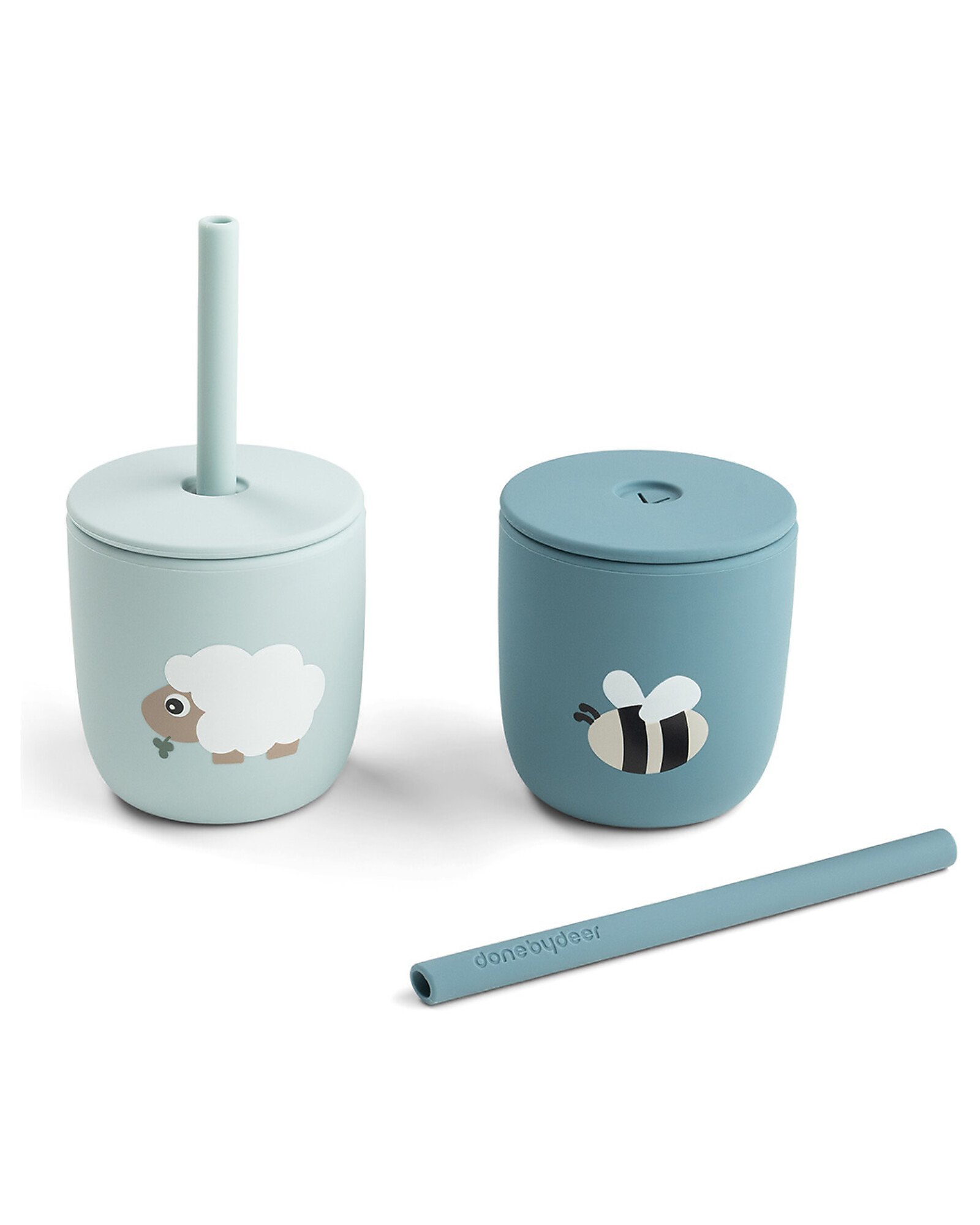 Set 2 Bicchieri con Tappo e Cannuccia 120 ml - Tiny Farm - Blu - 100% Silicone Alimentare - 12m+