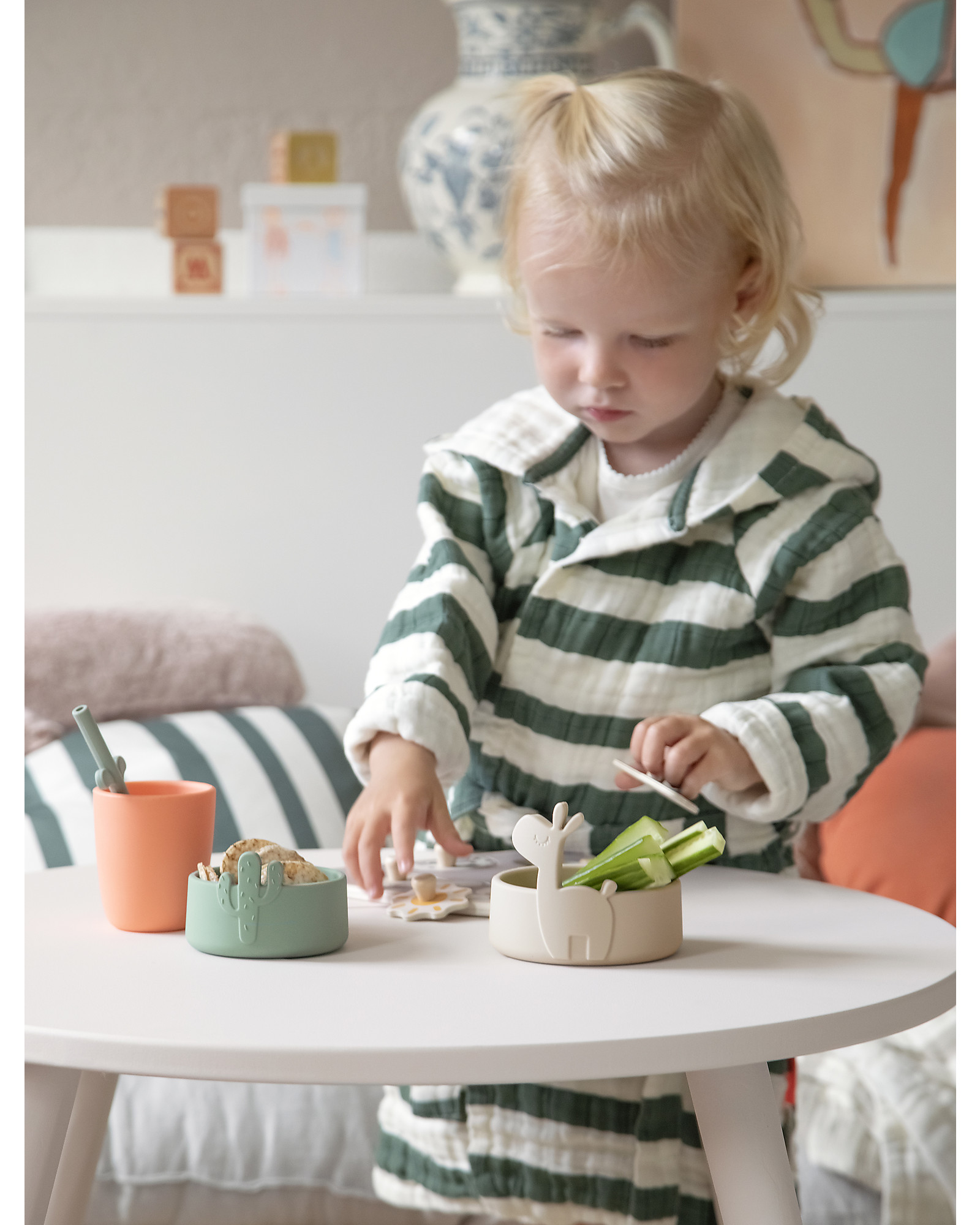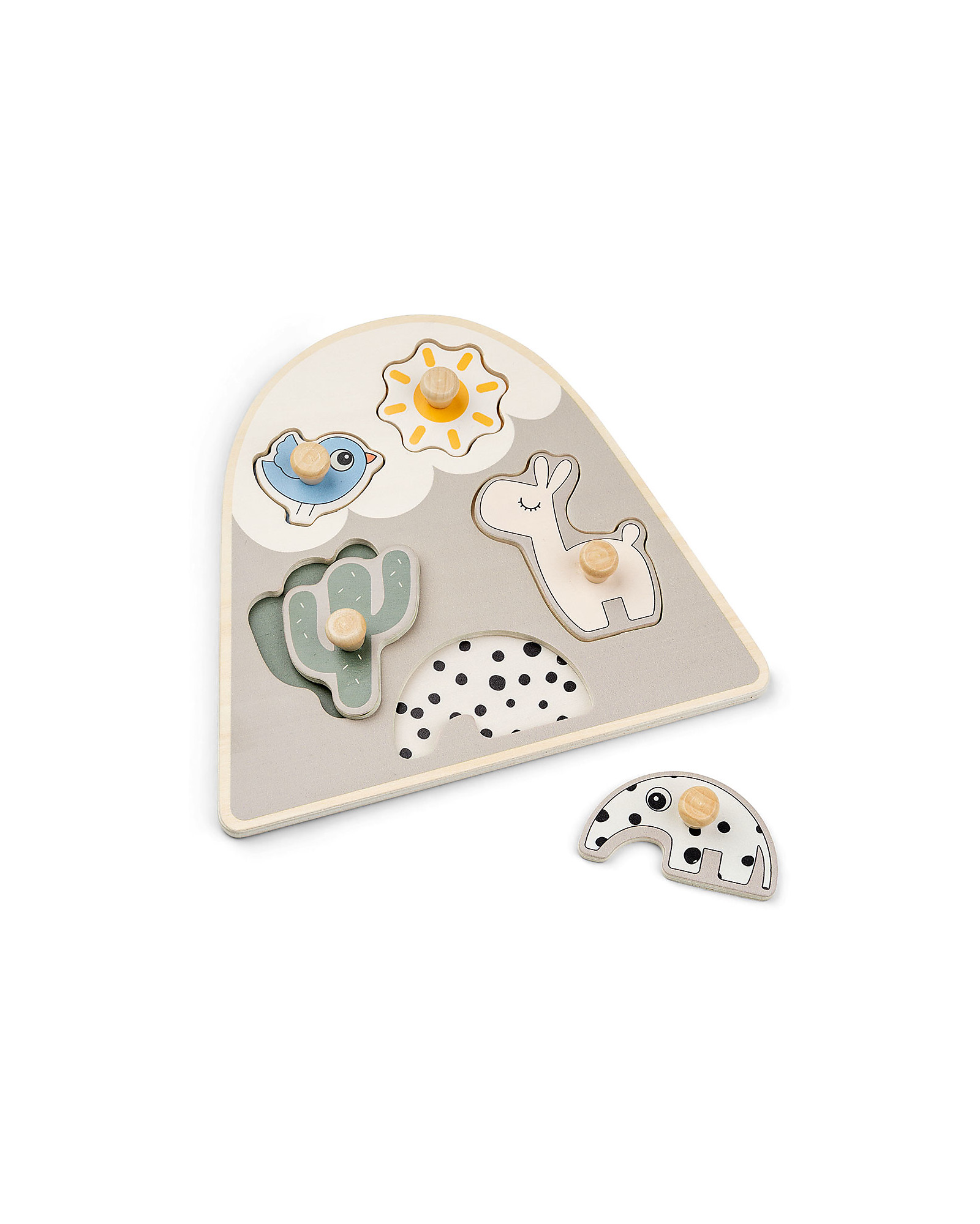 Il puzzle in legno Lalee firmato dal marchio di design danese Done by Deer, aiuterà il tuo bambino a esercitare le abilità motorie e lo aiuterà a sviluppare il pensiero logico e la risoluzione dei problemi. Il simpatico puzzle lama ha cinque pezzi di puzzle in legno, puoi afferrare i pezzi da gioco e aiutare Lalee, Birdee e Antee a rimettersi al proprio posto e a far sorgere il sole in cima alla montagna, ma manca il cactus. Deve essere posizionato ai piedi della montagna, ora tutti i pezzi sono al loro posto.