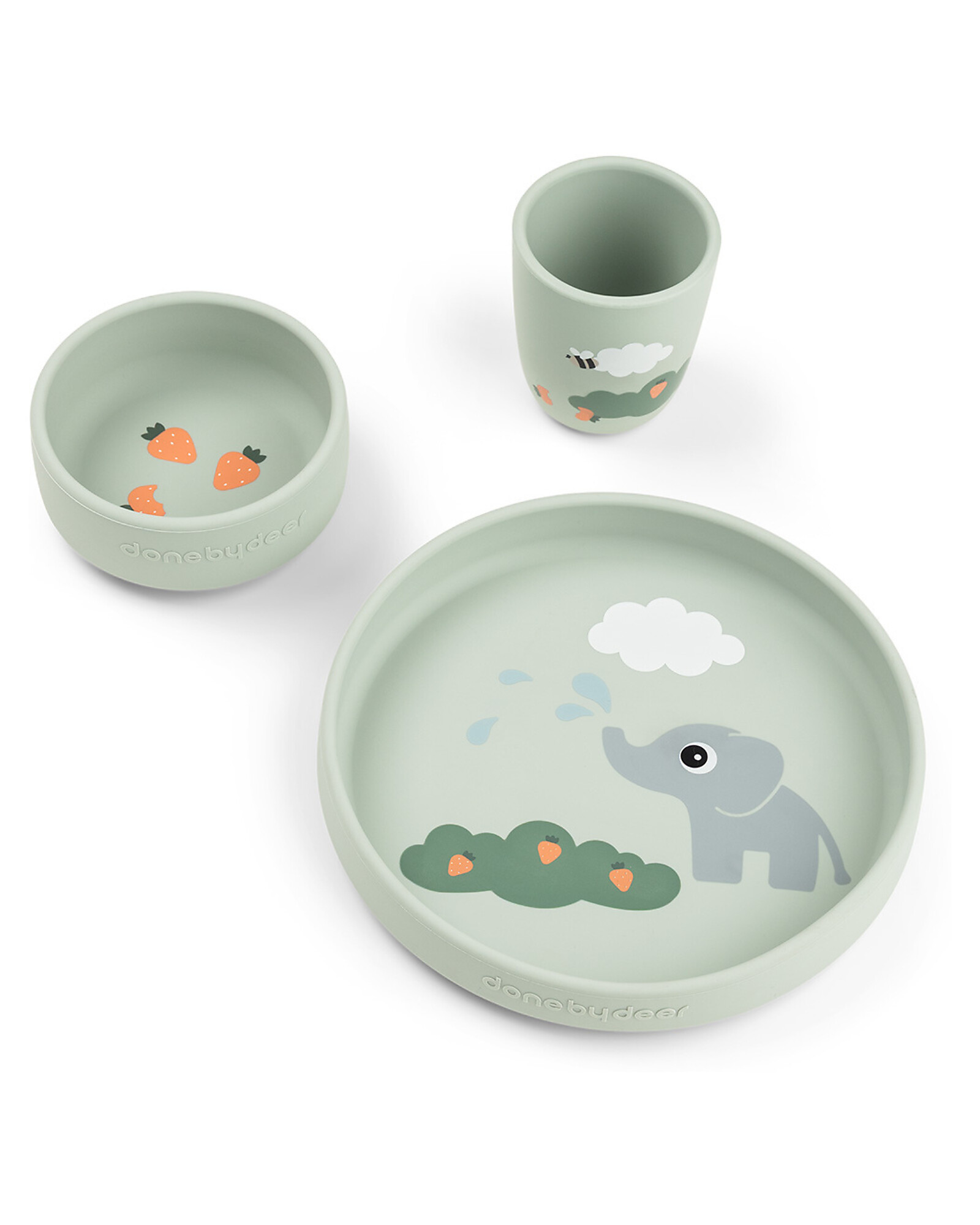 Questo meraviglioso set pappa del marchio danese Done By Deer include un piatto, una tazza ed una ciotola! Perfetti per rendere speciale ogni pasto, questo set è decorato da un amico di Deer: scegli quale più ti rappresenta! Un'idea semplice ma simpaticissima e pratica! Il piatto e la ciotola, poi, sono dotati basi speciali che garantiscono la loro adesione al tavolo facendoli restare in posizione durante i pasti: questo aiuterà il bambino durante i suoi primi pasti a tavola! Realizzato in 100% silicone alimentare, è un set ultra sicuro e igienico, poiché privo di sostanze chimiche nocive. Inoltre il materiale da cui è composto gli conferisce anche maneggevolezza e resistenza ad ogni caduta!