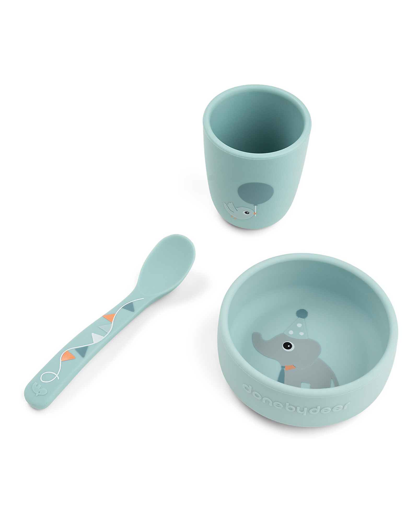 Il set pappa in silicone alimentare renderà divertente il pasto. Il pratico starter set in silicone antiscivolo e di facile presa comprende un cucchiaio per bambini, una ciotola e un bicchiere. Stoviglie perfette per neonati e bambini piccoli.