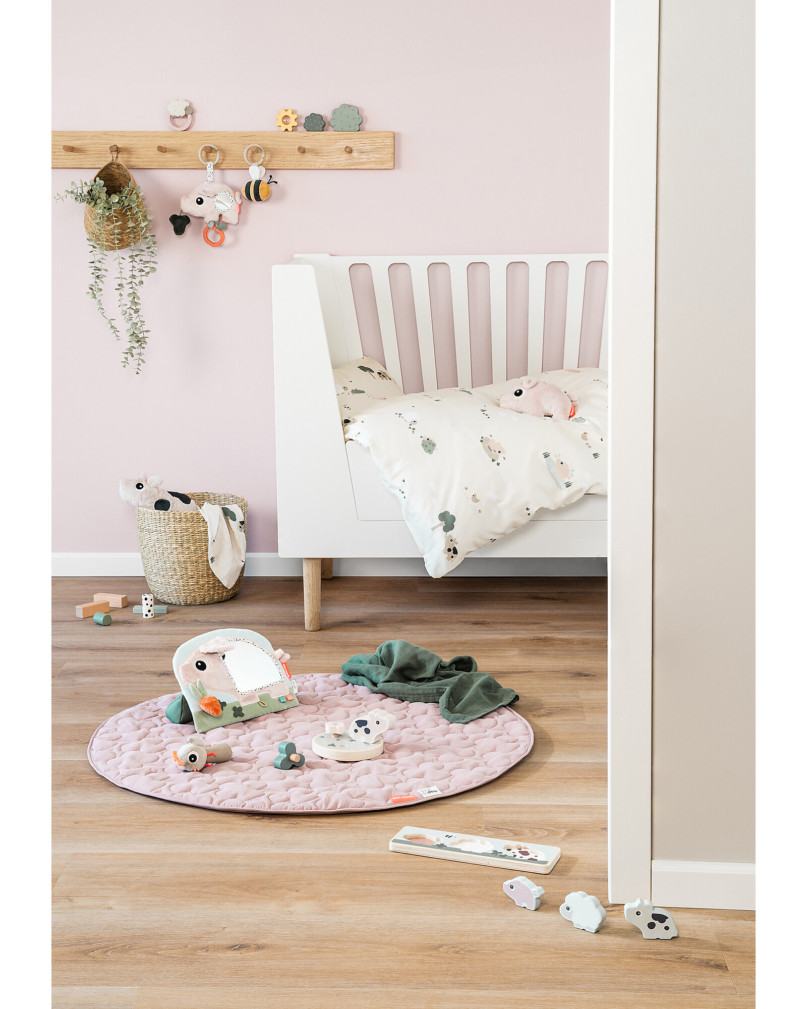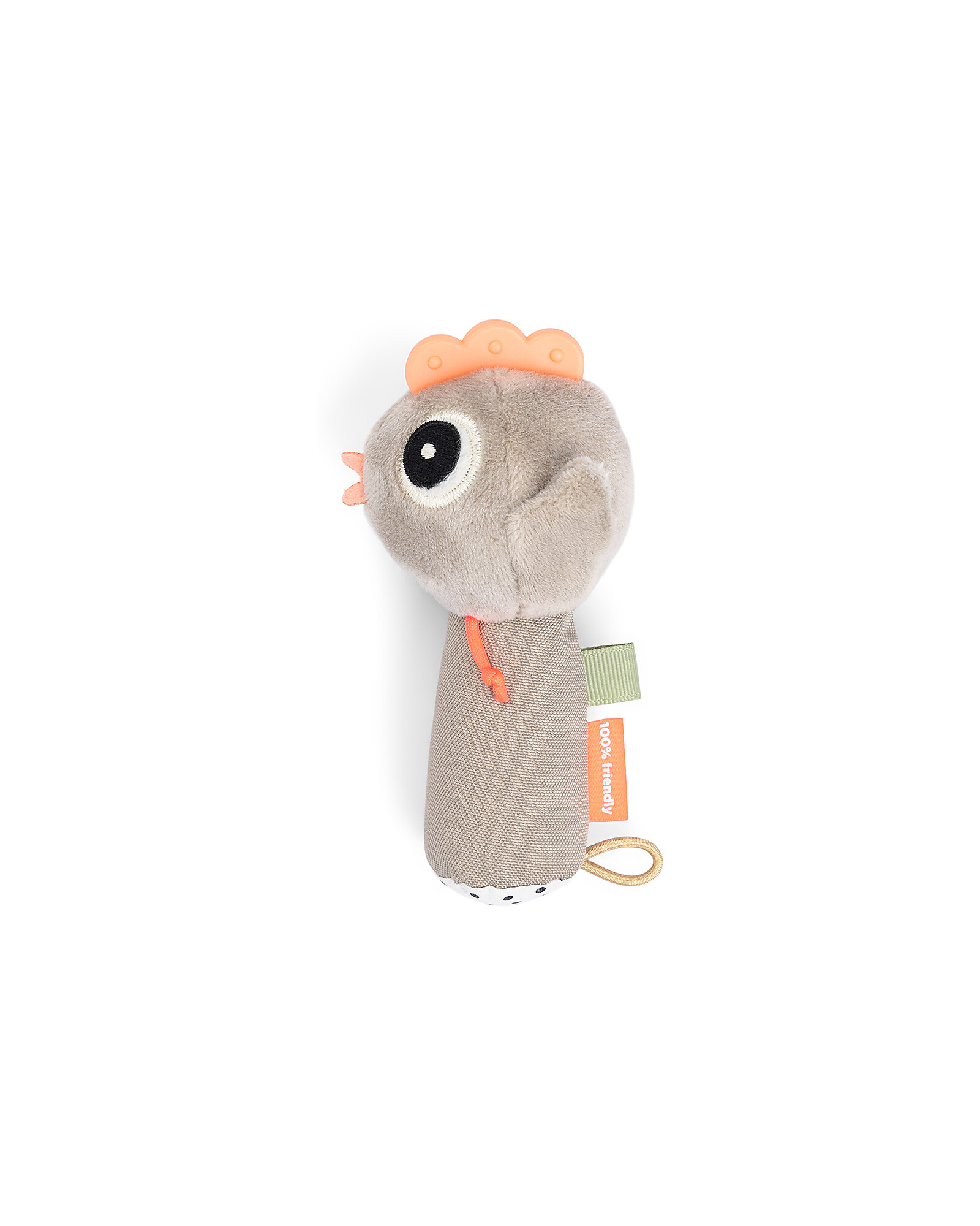 Il Sonaglio Sensoriale della nuova collezione Tiny Farm di Done by Deer è un giocattolo interattivo progettato per stimolare i sensi del bambino. Presenta elementi sensoriali come un sonaglio e diverse texture che coinvolgono i 5 sensi. La cresta del gallo funge anche da anello da dentizione, offrendo sollievo per le gengive irritate. Il design morbido nei toni sabbia, con contrasti stimola la vista. Grazie all'anello elastico, può essere facilmente attaccato a una palestra o ad altri giocattoli, rendendolo pratico e facilmente trasportabile. Perfetto per il primo sonaglio del bambino, questo giocattolo favorisce lo sviluppo sensoriale e motorio. La sua forma e i materiali sono ideali per le mani dei più piccoli, rendendolo un giocattolo educativo, divertente e rassicurante.