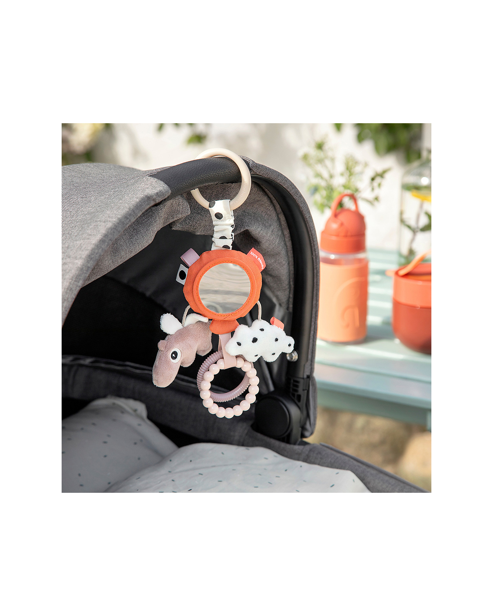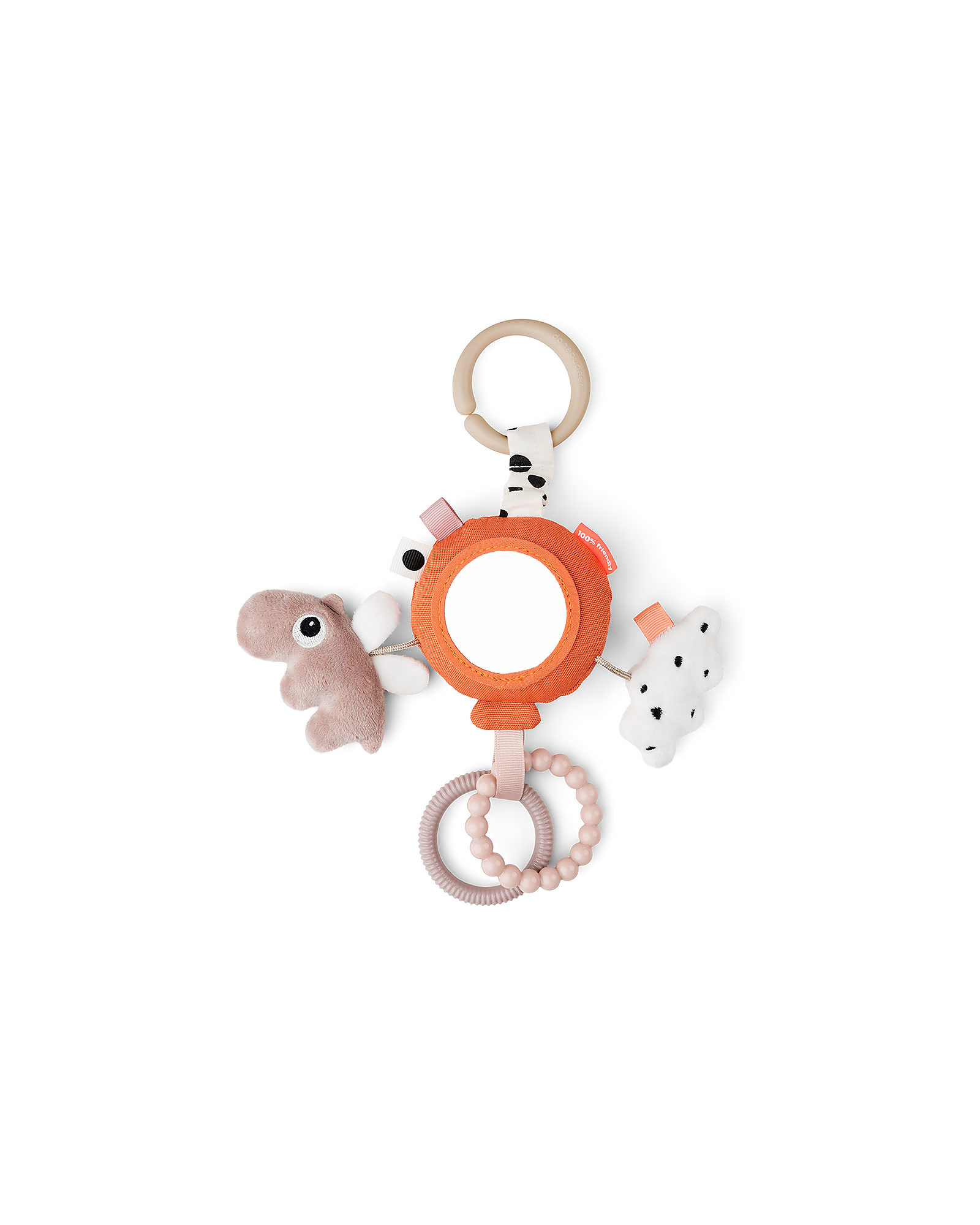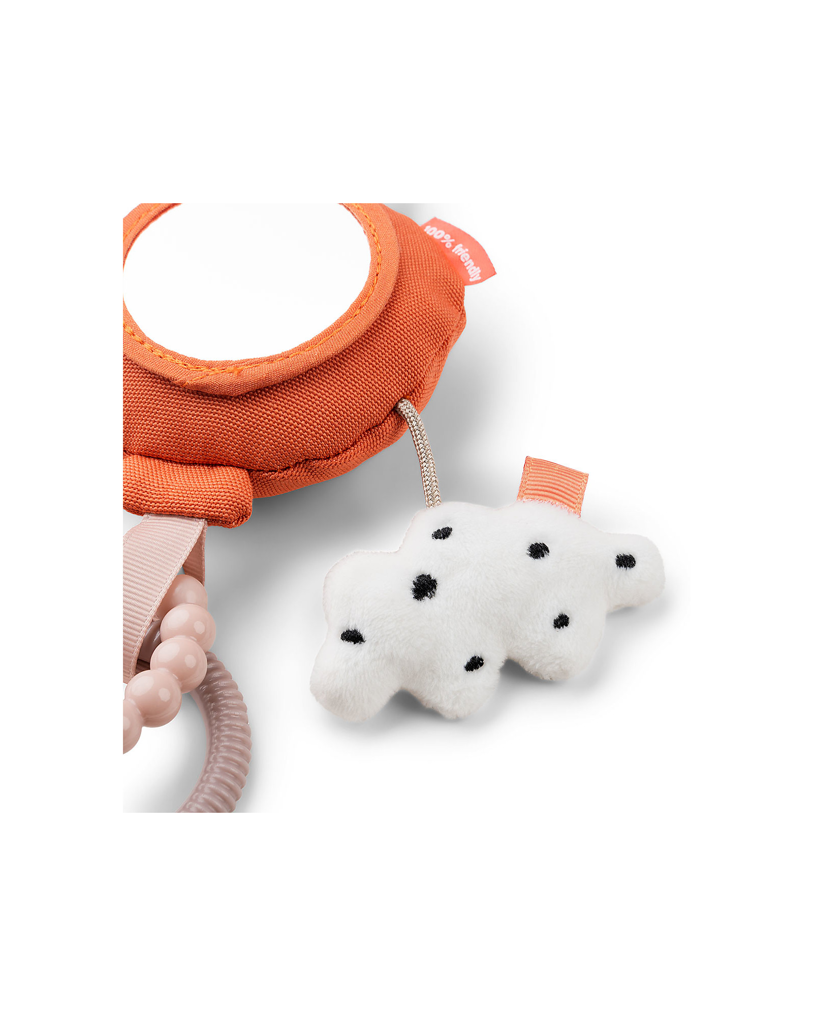 Lo specchio delle attività ha un sonaglio a palloncino, un Ozzo e una nuvola delicatamente strutturati, due anelli testurizzati e divertenti etichette. Il bambino può afferrare facilmente gli anelli e tenere lo specchio delle attività. Usa il collegamento del giocattolo per attaccarlo alla carrozzina, al seggiolino auto o al cuscino per quando il tuo bambino sta sulla pancia.