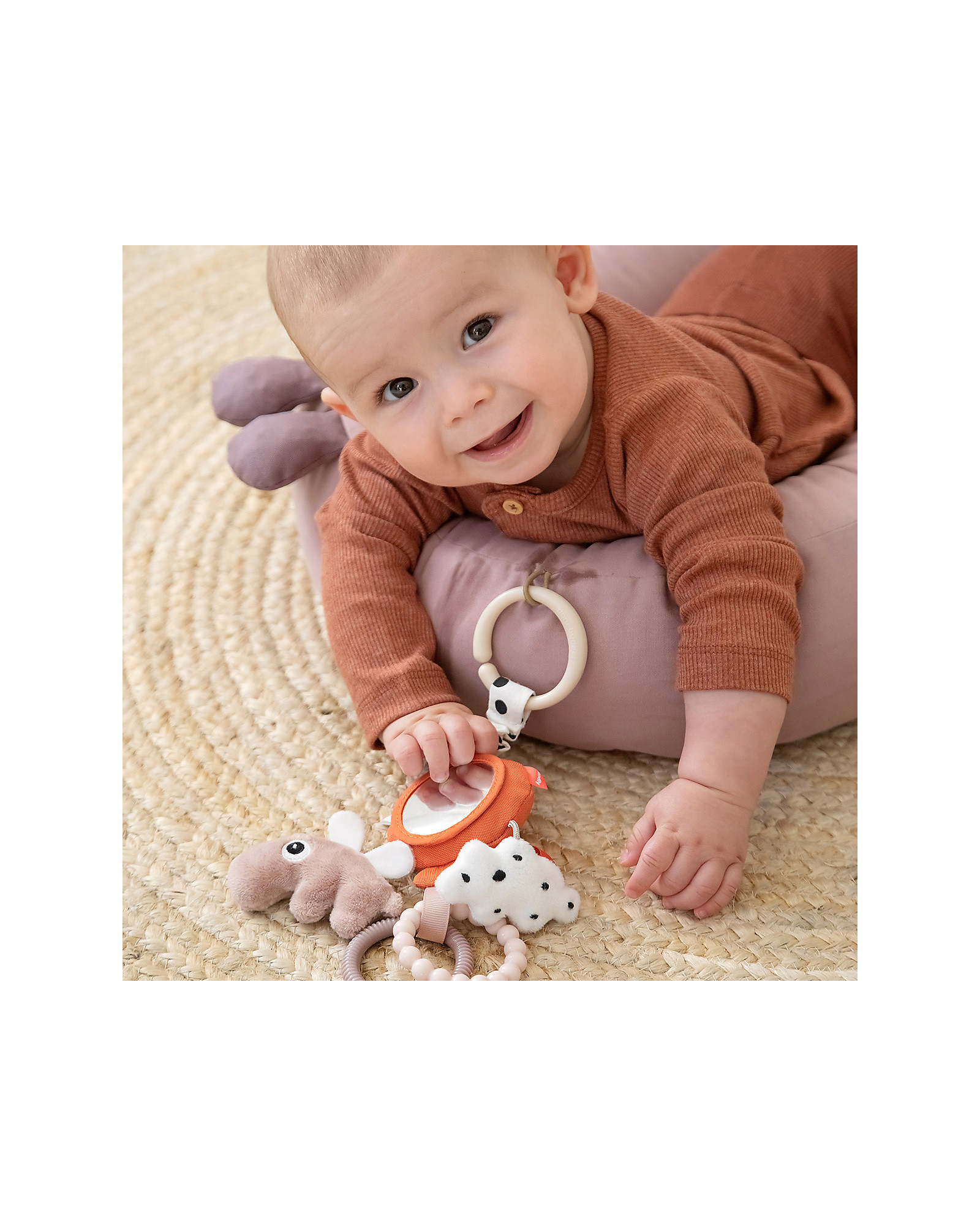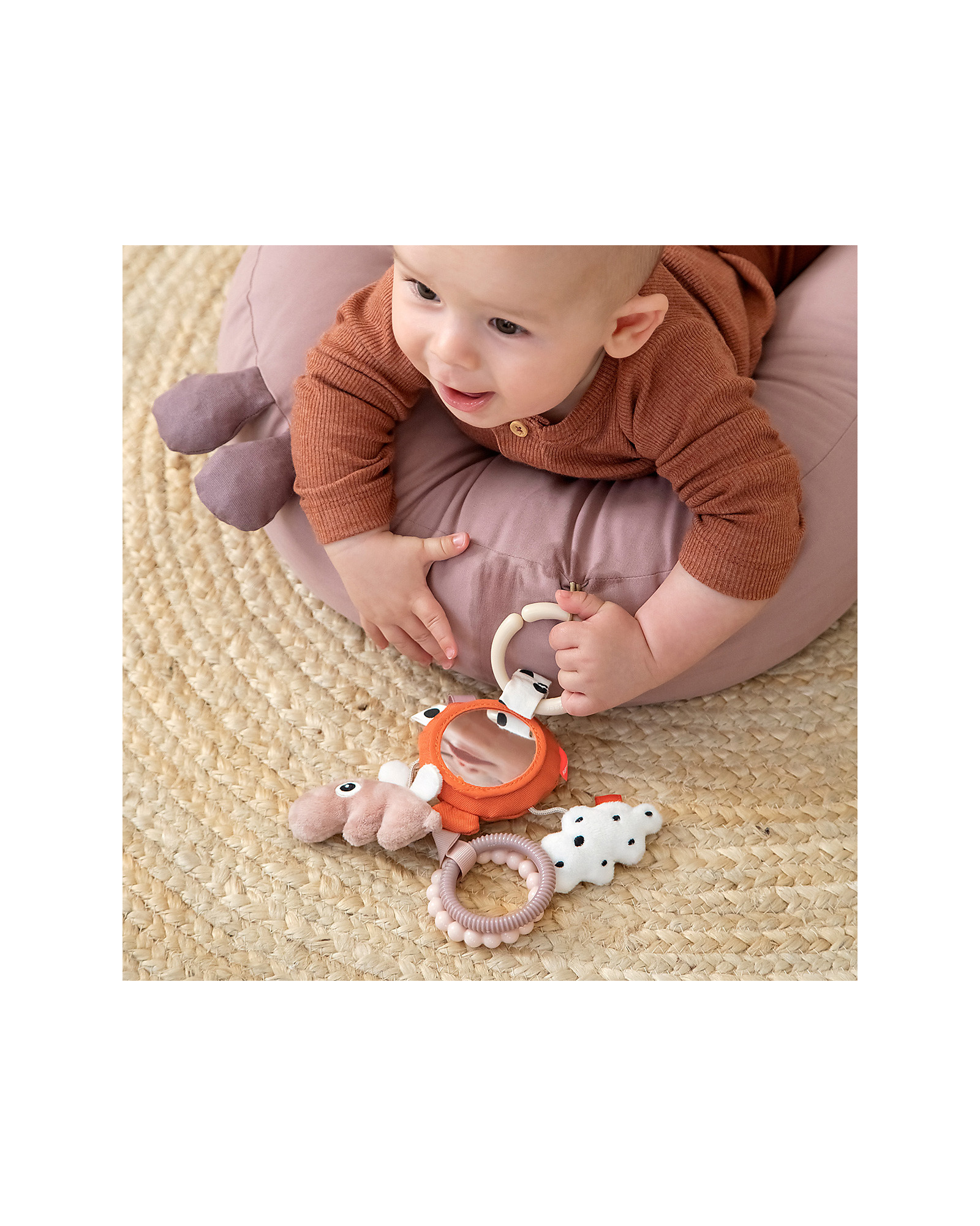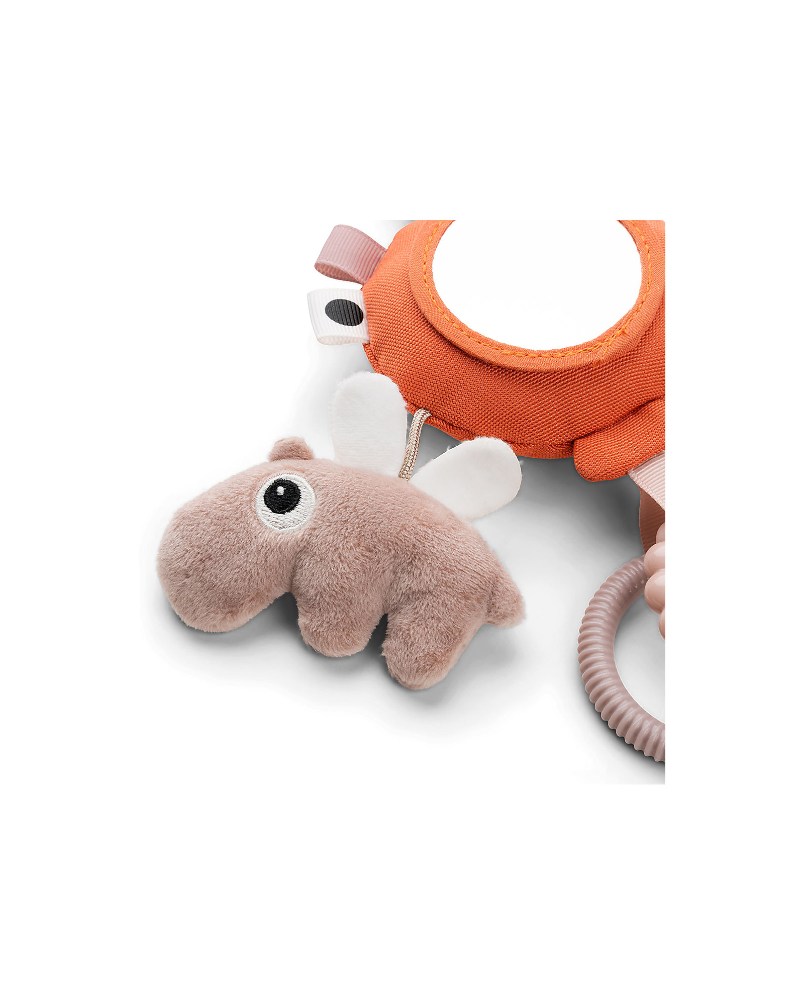 Lo specchio delle attività ha un sonaglio a palloncino, un Ozzo e una nuvola delicatamente strutturati, due anelli testurizzati e divertenti etichette. Il bambino può afferrare facilmente gli anelli e tenere lo specchio delle attività. Usa il collegamento del giocattolo per attaccarlo alla carrozzina, al seggiolino auto o al cuscino per quando il tuo bambino sta sulla pancia.