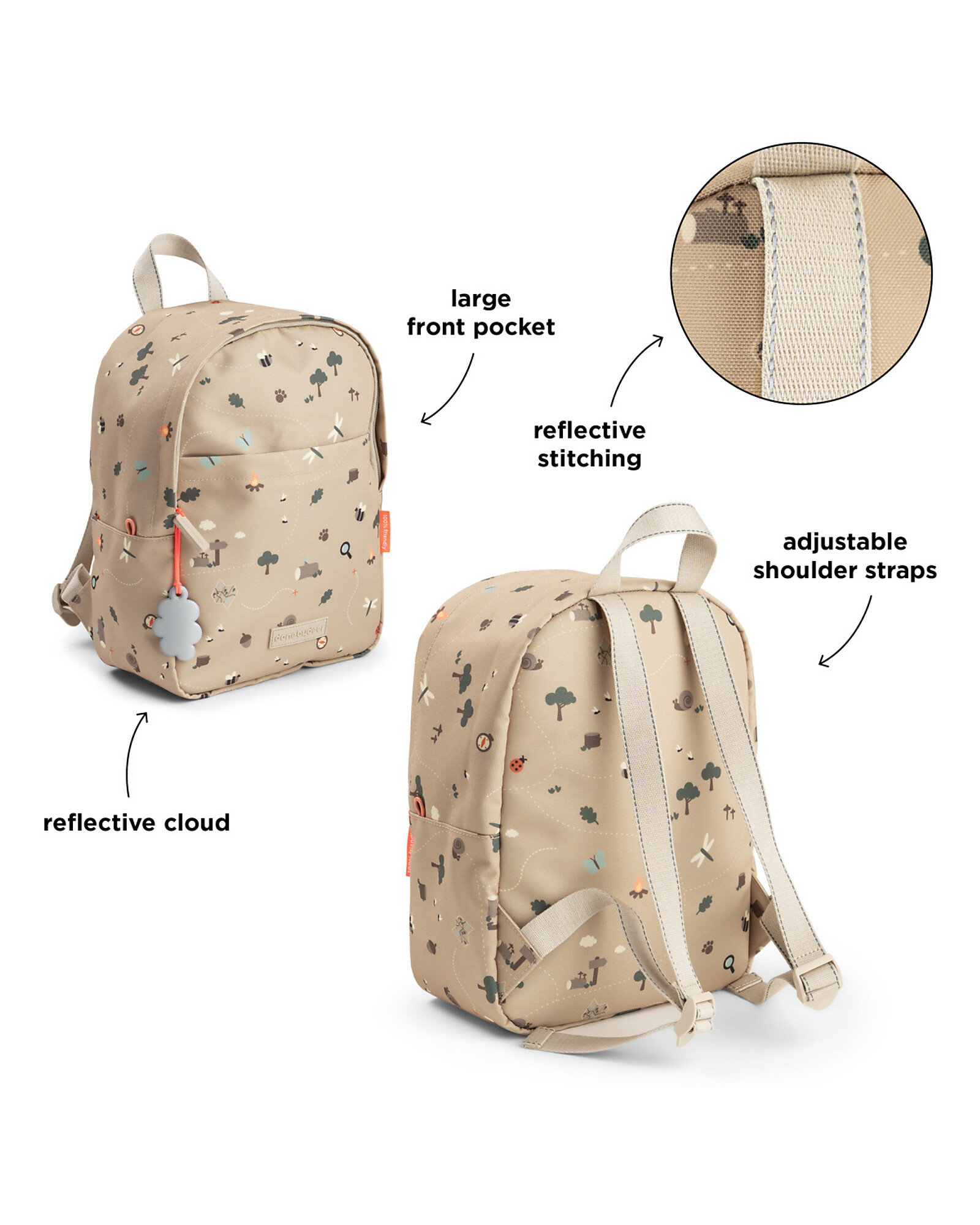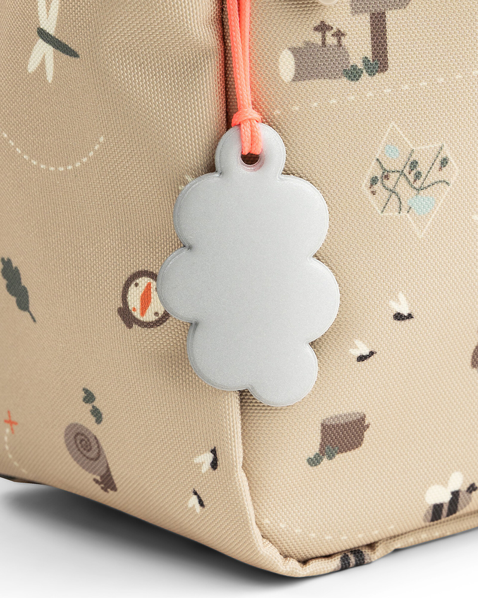I dettagli riflettenti su spallacci e maniglia aumentano la visibilità, mentre la nuvoletta riflettente removibile aggiunge sicurezza e un tocco giocoso. La grande tasca frontale consente un accesso rapido agli oggetti essenziali, e il name tag interno aiuta a identificarlo facilmente.