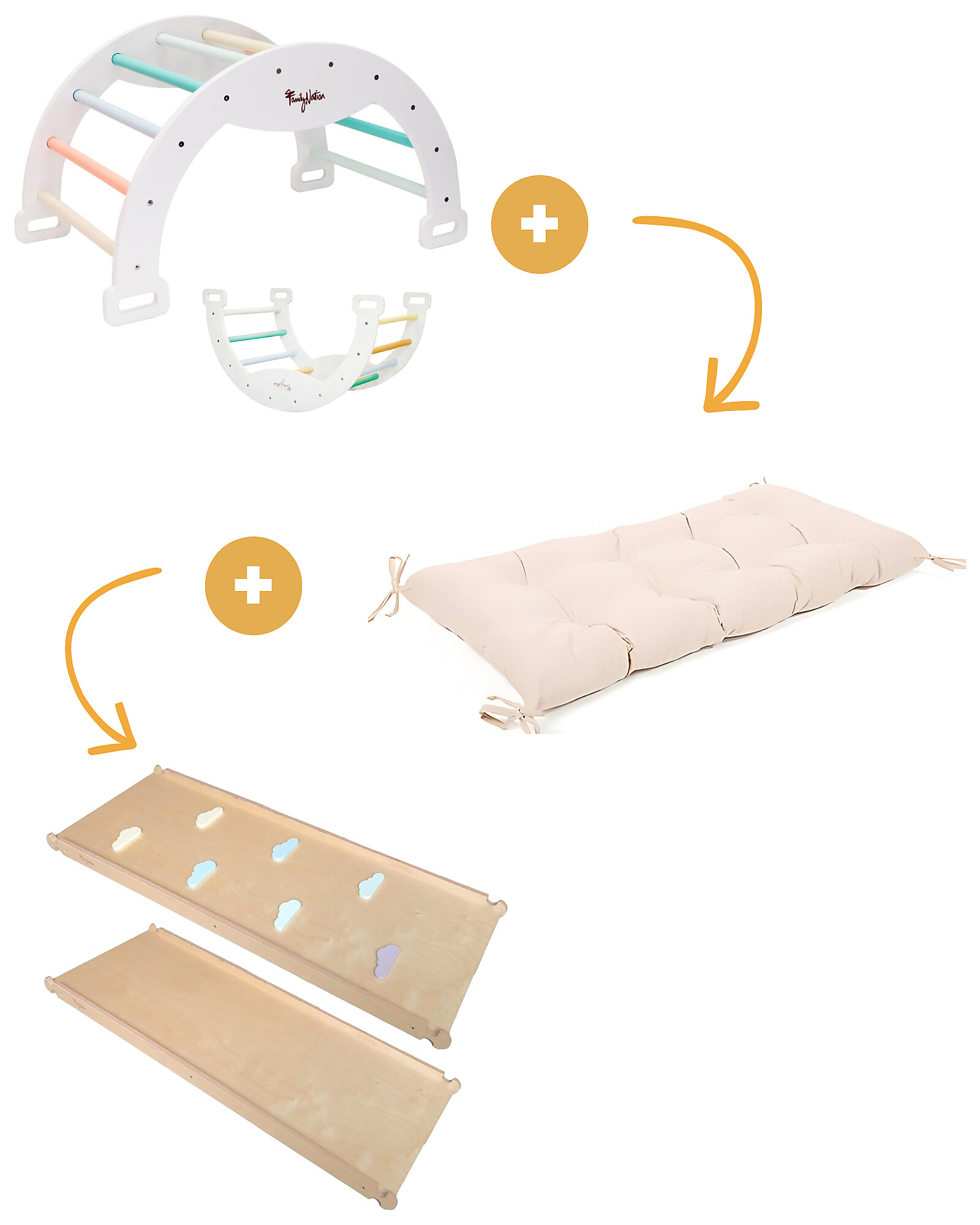 Arco Montessori Rainbow - Sunny Beach + Cuscino + Scivolo/Rampa Rainbow 2 in 1 - Sviluppa Equilibrio e Agilità