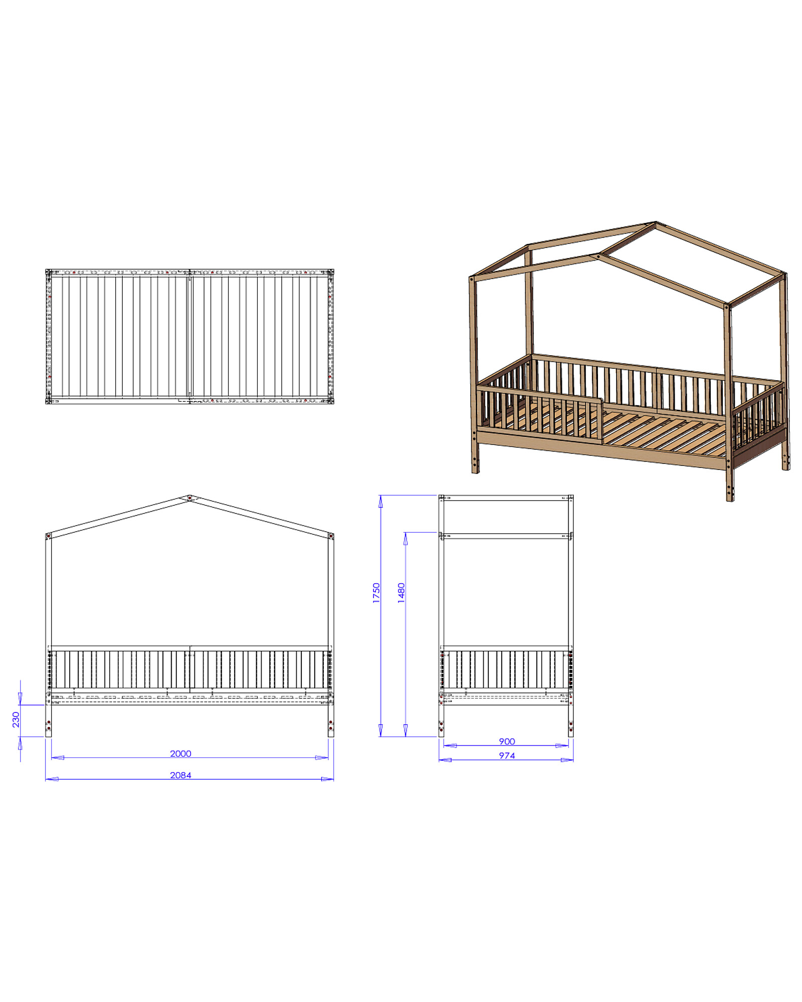 - Il Kit Include: la base letto, 5 sponde (testiera, pediera, sponda laterale in due parti e una sponda anticaduta sul lato di accesso), la struttura con tetto a casetta, doghe e gambe per letto singolo.