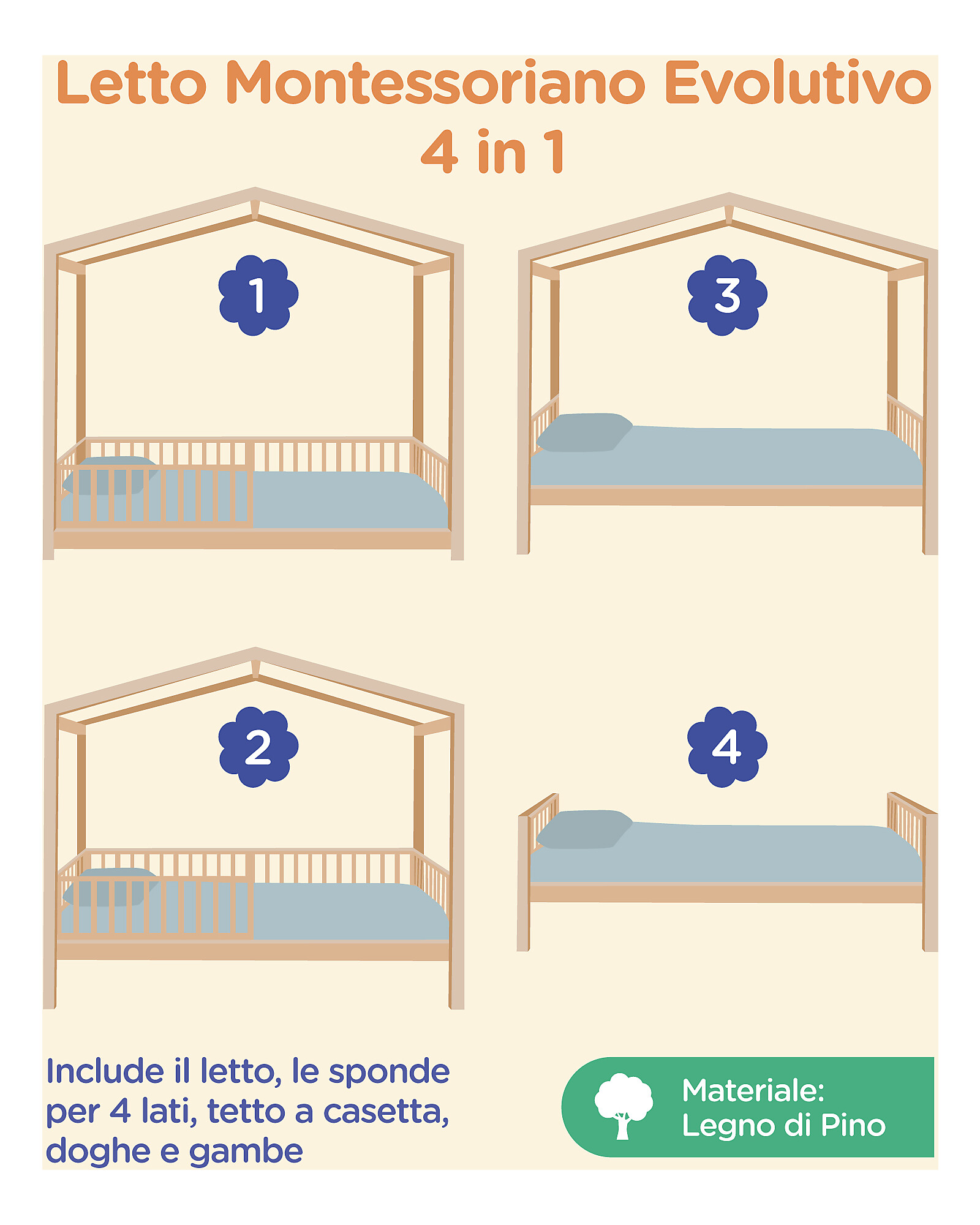 Caratteristiche prodotto del Letto Montessori Evolutivo Evi 4 in 1