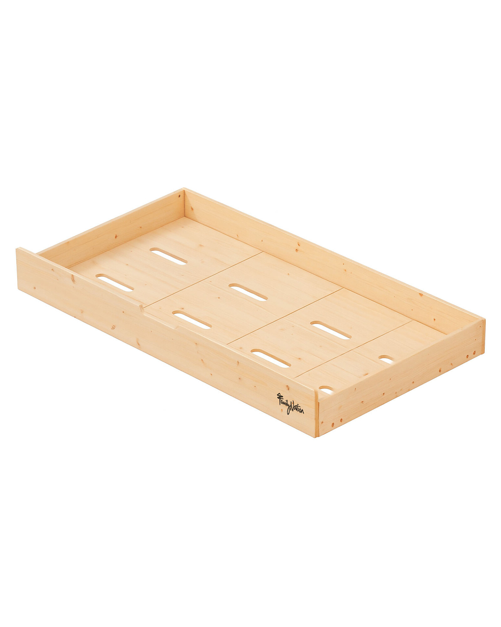 Accanto a questo, il Cassetto Contenitore 2-in-1 Evi offre una soluzione versatile che ottimizza lo spazio. Può essere utilizzato come ampio contenitore per riporre giochi, coperte, libri e altri oggetti. La sua struttura è progettata per garantire stabilità e comfort. Realizzato in legno naturale senza trattamenti chimici, rispetta gli standard di sicurezza europei UNI EN 1725:2023. Inoltre, il fondo forato permette la giusta ventilazione, assicurando igiene e freschezza.