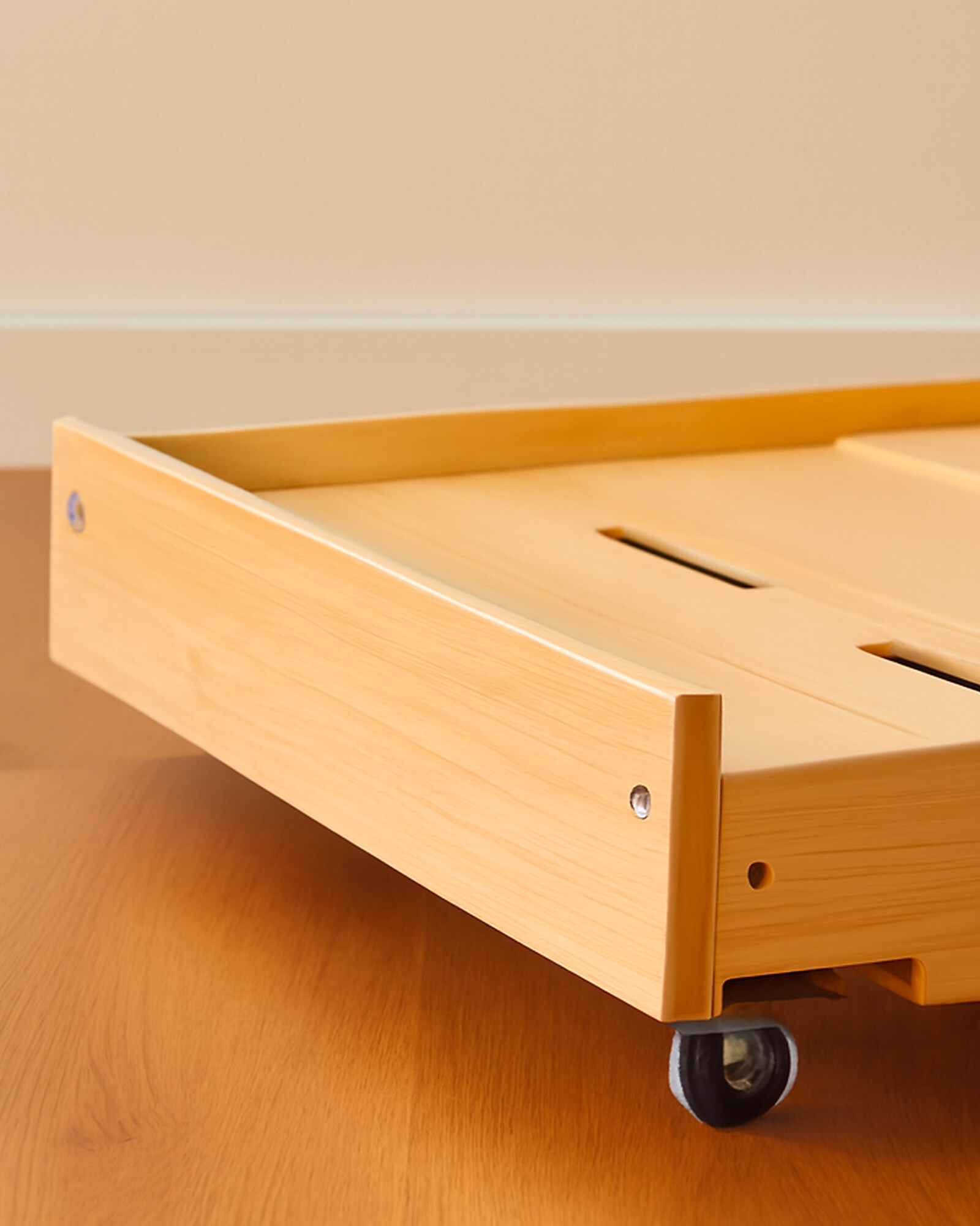 - Per utilizzare il cassetto come contenitore: monta i pannelli forati dedicati per creare uno spazio chiuso e protetto ma areato, inserisci l’occorrente e fai scorrere il cassetto sotto il letto, grazie alle ruote, il movimento sarà fluido e senza sforzo.