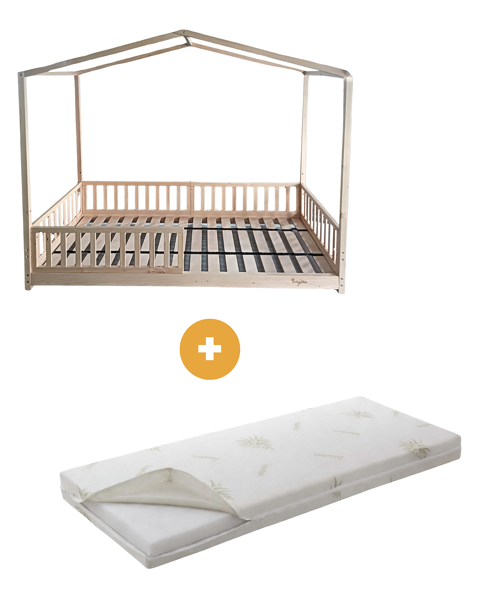 Il kit completo contiene: base letto, 5 sponde, struttura con tetto a casetta, doghe e due set di gambe (per casetta e letto singolo). Realizzato in legno di pino naturale, levigato a mano con finitura satinata e confezionato senza plastica, unisce qualità, sostenibilità e bel design.