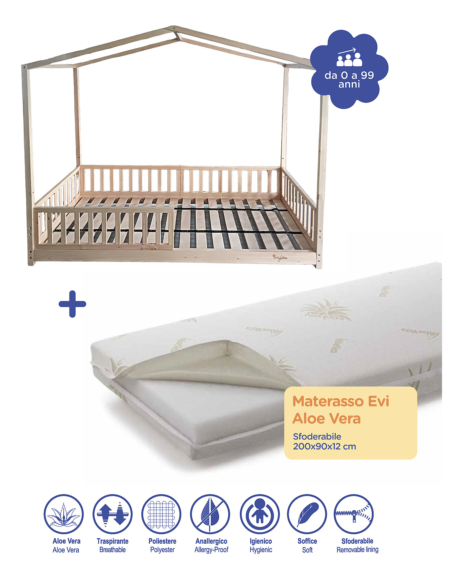 Set 2: Letto Montessori Evolutivo Evi 140x70cm + Materasso 11 cm Aloe Vera