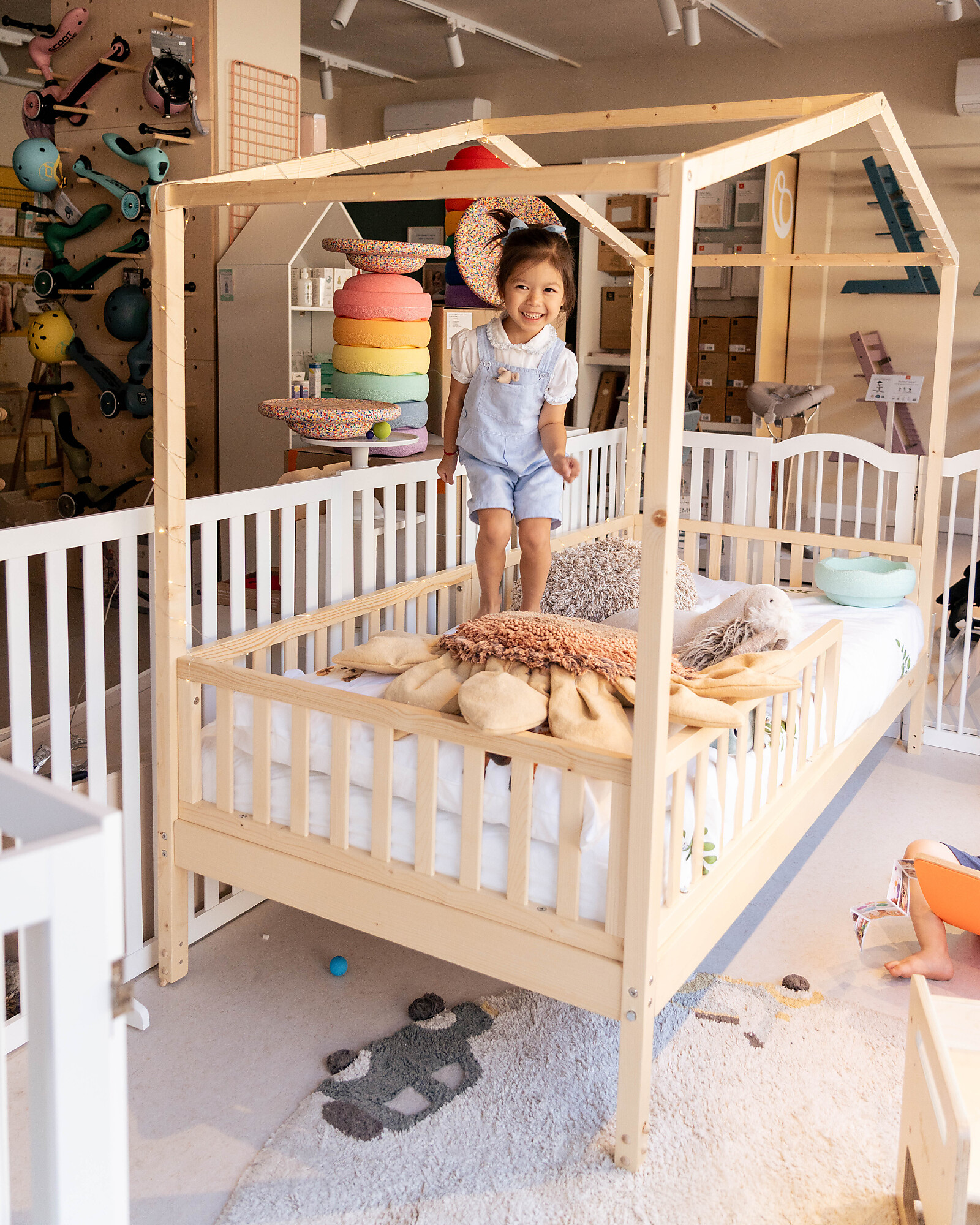 - Facilmente trasformabile – La base si può sollevare senza aggiungere piedi aggiuntivi, le sponde sono modulabili e si può togliere la struttura a casetta rendendolo pratico da adattare nel tempo.