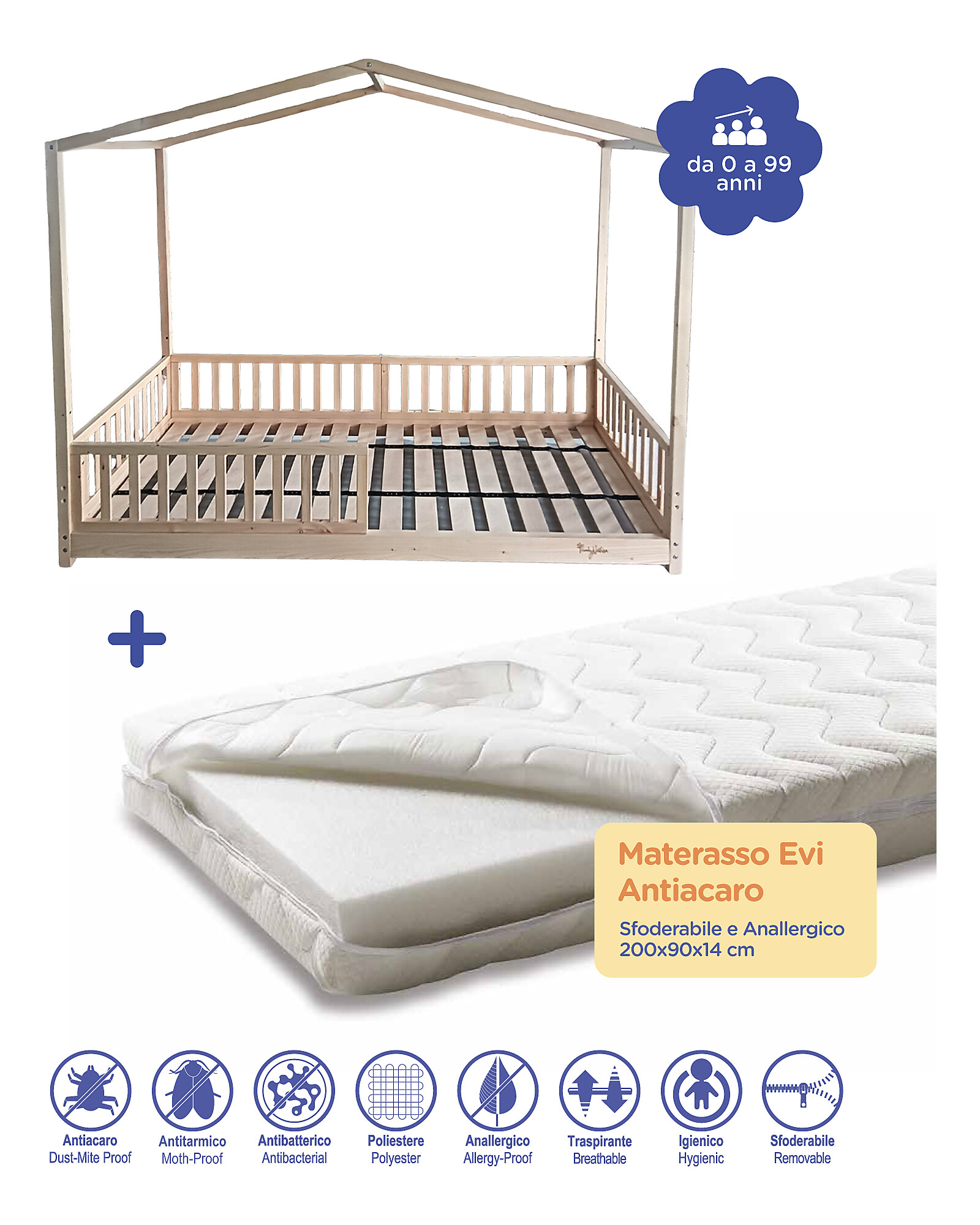 Set 2: Letto Montessori Evolutivo Evi 200x90cm + Materasso 14 cm Antiacaro