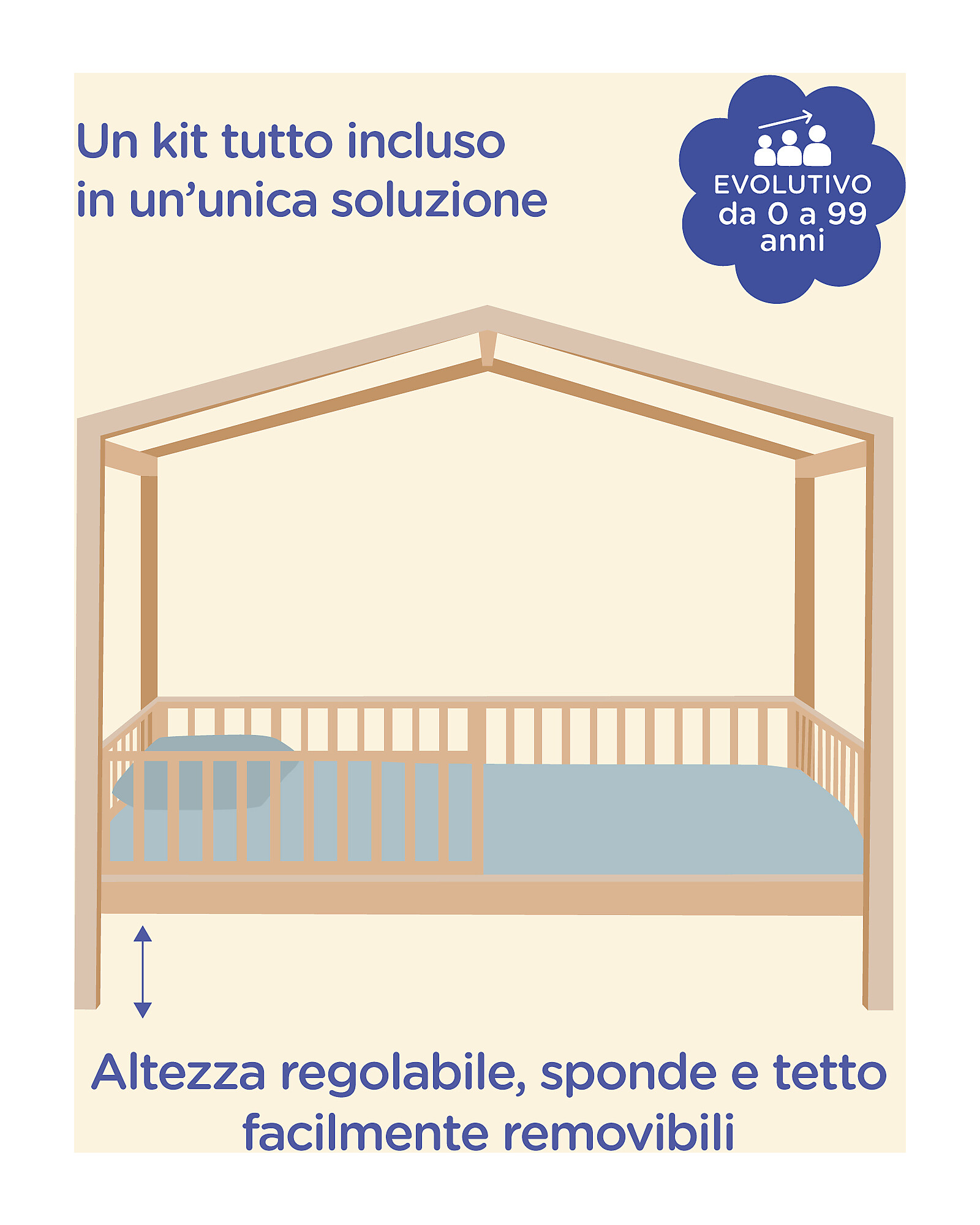 - Facilmente trasformabile – La base si può sollevare senza aggiungere piedi aggiuntivi, le sponde sono modulabili e si può togliere la struttura a casetta rendendolo pratico da adattare nel tempo.