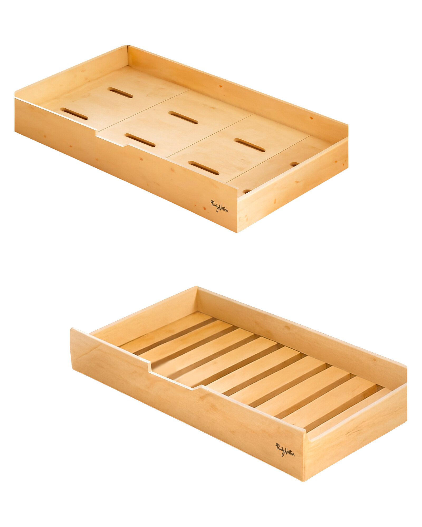 - Due fondi in dotazione: fondo cassetto con fori di areazione e doghe per l’uso come secondo letto