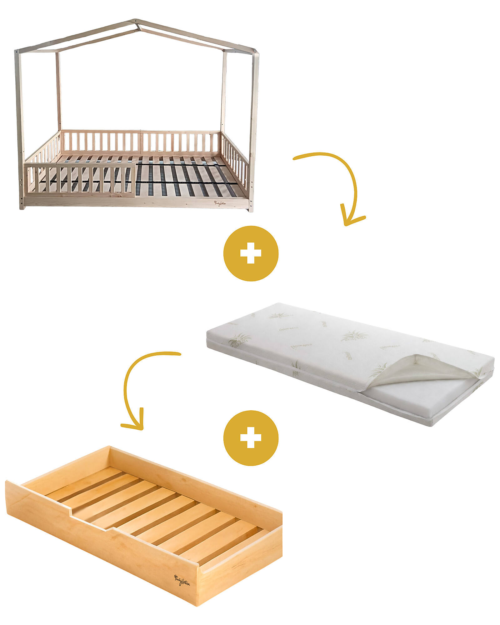 Set 3: Letto Montessori Evolutivo Evi 200x90cm + Letto/Cassetto + Materasso 12 cm Aloe Vera