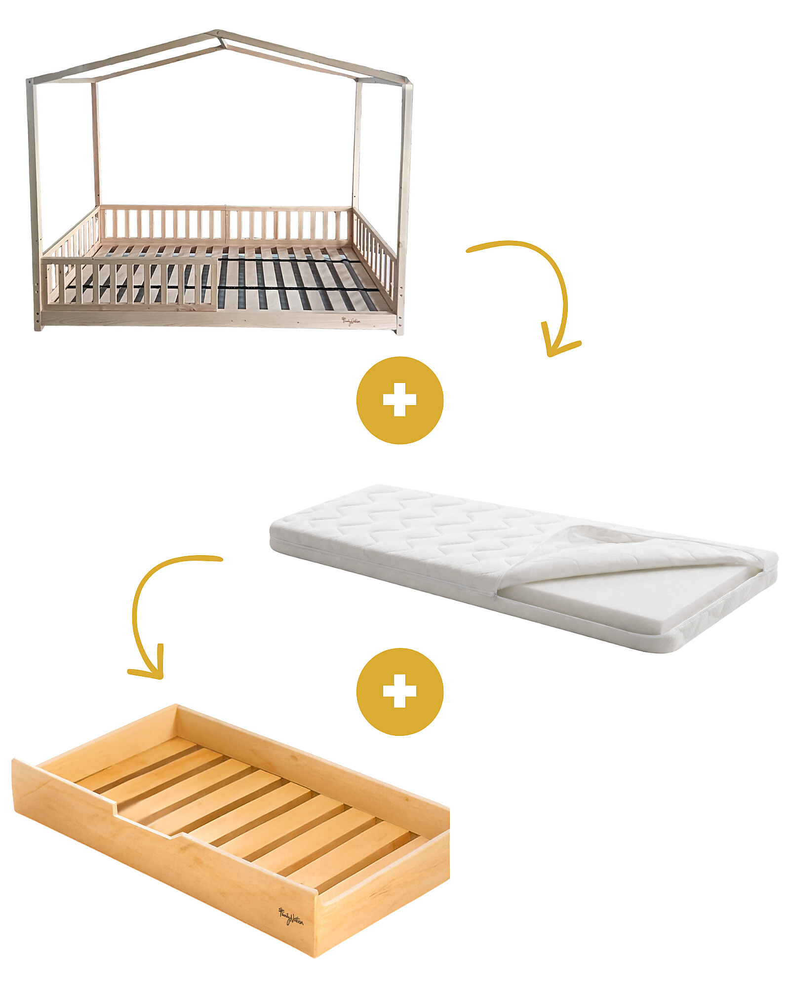 Set 3: Letto Montessori Evolutivo Evi 200x90cm + Letto/Cassetto + Materasso 14 cm Antiacaro