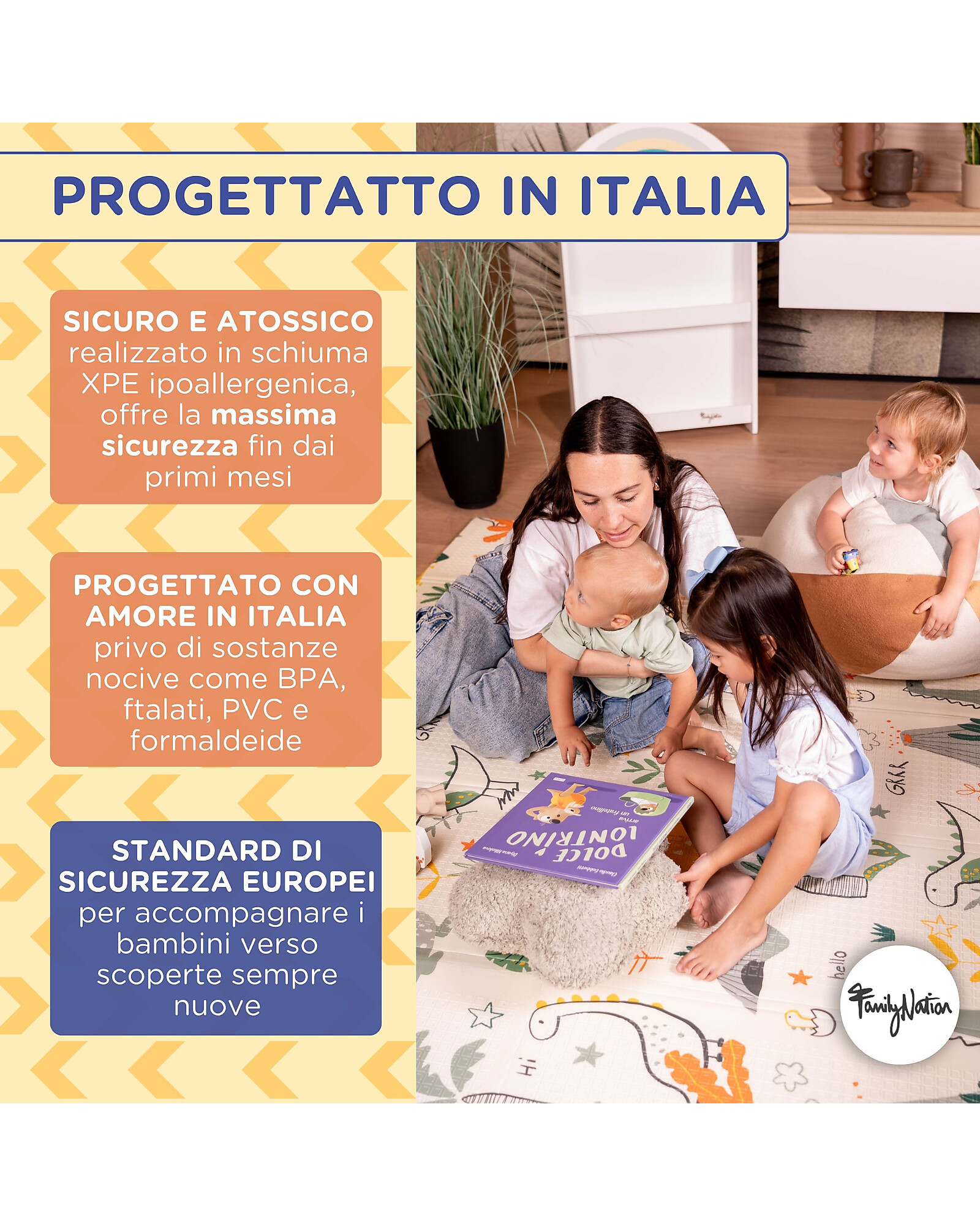 - Sicuro fin dai primi mesi – Realizzato in schiuma XPE ipoallergenica, è completamente atossico, impermeabile e antiscivolo.