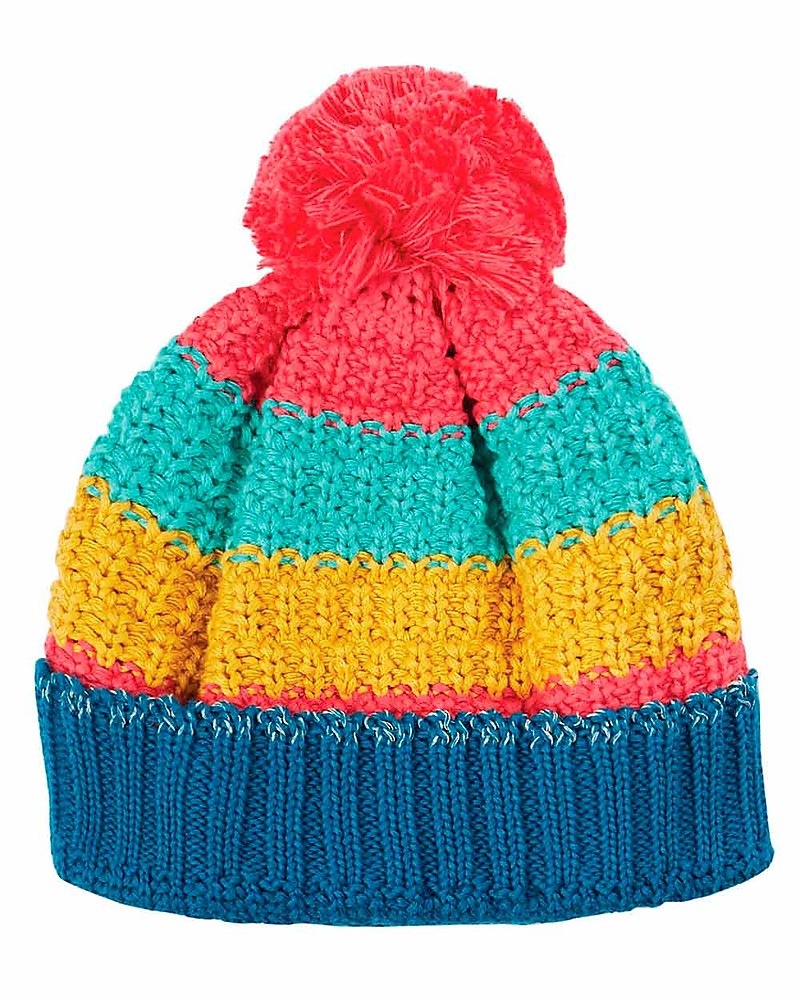 Lavorato a maglia questo cappello è decorato da righe arcobaleno, completate da un graziosissimo pompon superiore per un'esplosione finale di tenerezza e allegria! Si abbina su tutto e con tutto, ed è ultra colorato con dettagli riflettenti!
